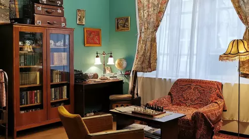 Далее повернуть налево и идти вдоль Аминьевского шоссе. После светофора повернуть налево на улицу Козлово, и следом выйти на ул.Вересаева. Студия находится в трехэтажной пристройке к дому 15, вход со стороны д.17. Серая дверь, над которой весит деревянный олень, затем вниз по лестнице.
