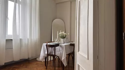 Комната, имитирующая жилую спальню. С большим количеством естественных светильников и зеркалами.Рядом находится ванная комната