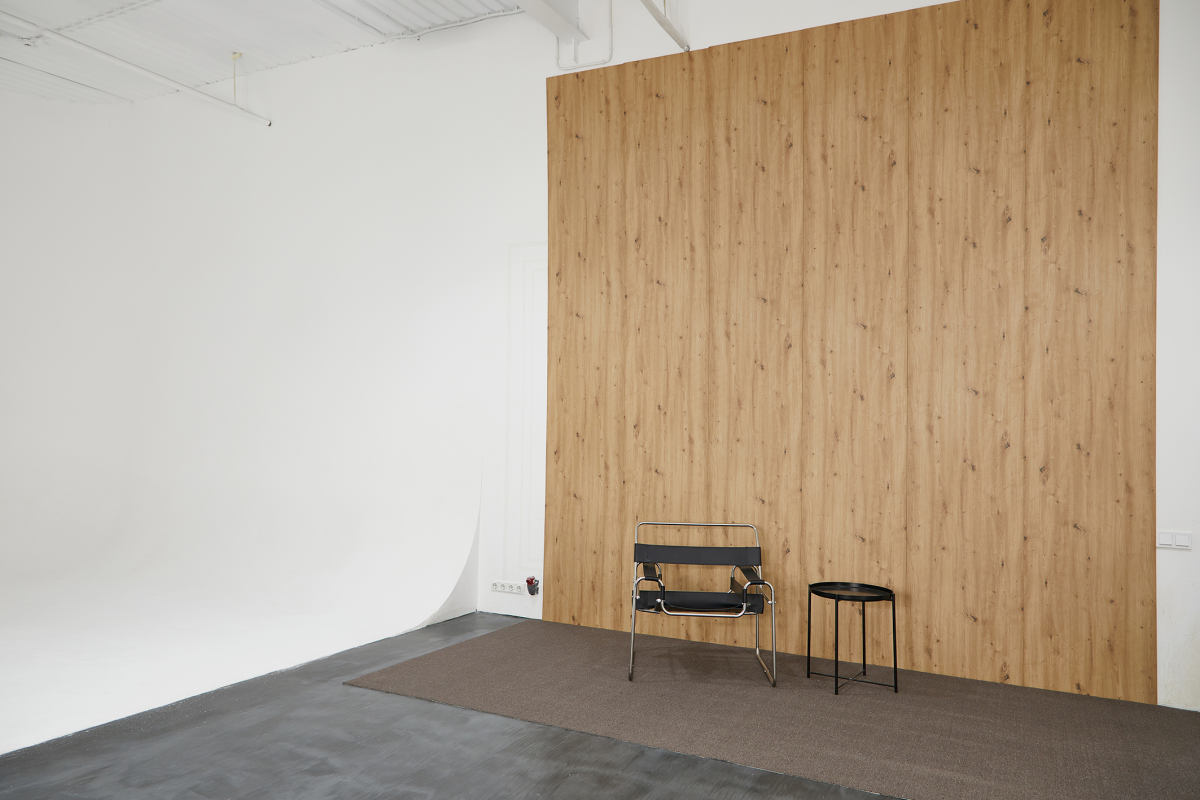 Большой функциональный зал с тремя большими окнами и угловой циклорамой 7,5 х 5 метров. В зале бетонные полы, деревянная стена под дуб, разнообразная мебель и гримерный стол. Идеален для масштабных съемок. Оборудование Profoto D2. Пилон и возможность крепления подвесов для гимнастов.