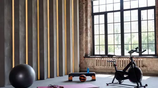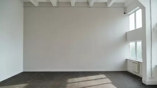 Просторный зал с двумя большими окнами и глубокой циклорамой 6 х 6 метров . В зале бетонные и деревянные полы, разнообразные фактурные стены в темных тонах, лофт мебель и гримерный стол.