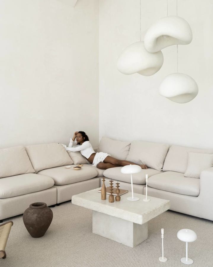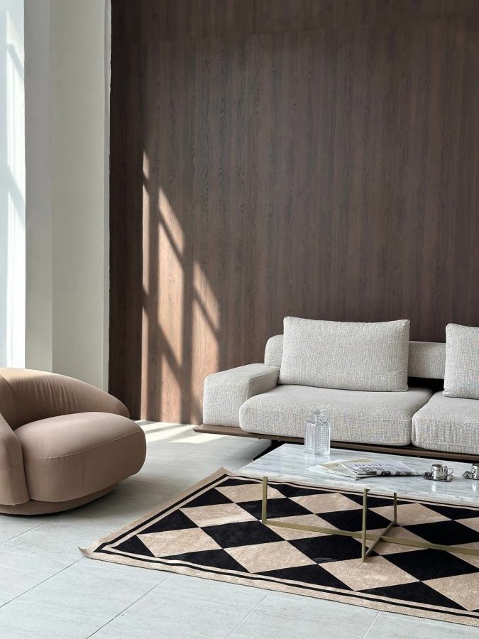 В духе современных апартаментов. Натуральные текстуры, идеальный светЗал 2в1 : продуманная интерьерная зона и фоны для съемок каталогов - бетонная & чистая белая пустая стена ...