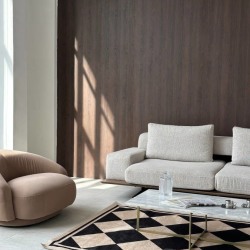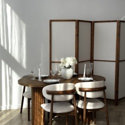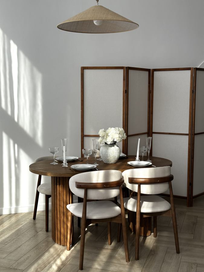 Теплый деревянный стиль с классической кроватью и обеденной зоной. Светлая минималистичная спальня вместе с гостиной, столом и элегантным декором...