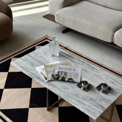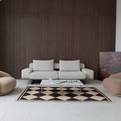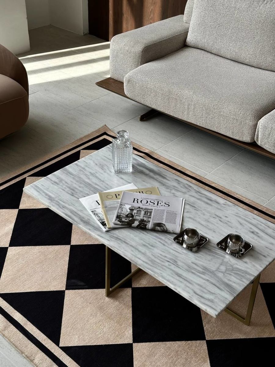 В зале: белый диван, два кресла , картина , акцентный ковер, реквизит на журнальном столике.