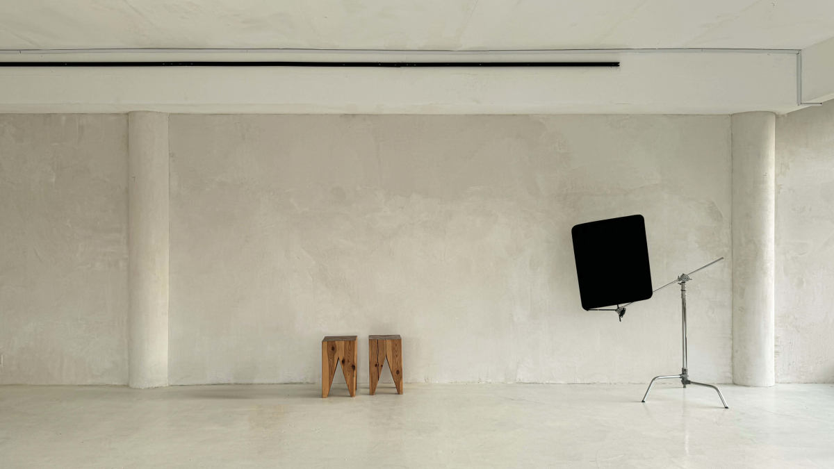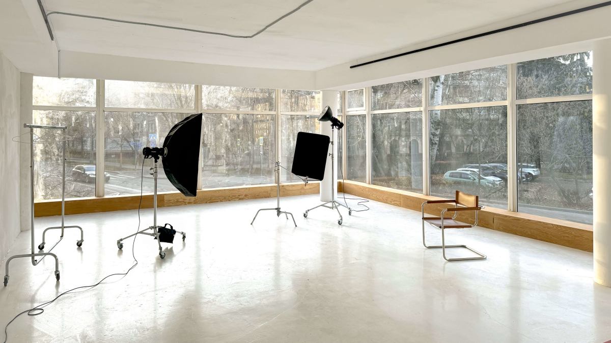 Минималистичный светлый зал с белыми стенами, большое окно во всю стену с возможностью полного затемнения, циклорама. Возможность установки любого фона
