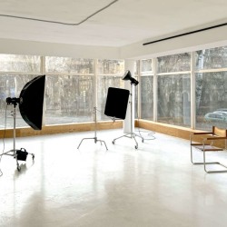 Огромный светлый зал с большими панорамными окнами по двум стенам, выходящим на юго-запад, что даёт яркий падающий свет в послеобеденное время, гримерное место, возможность установки любого фона из наличия.