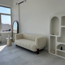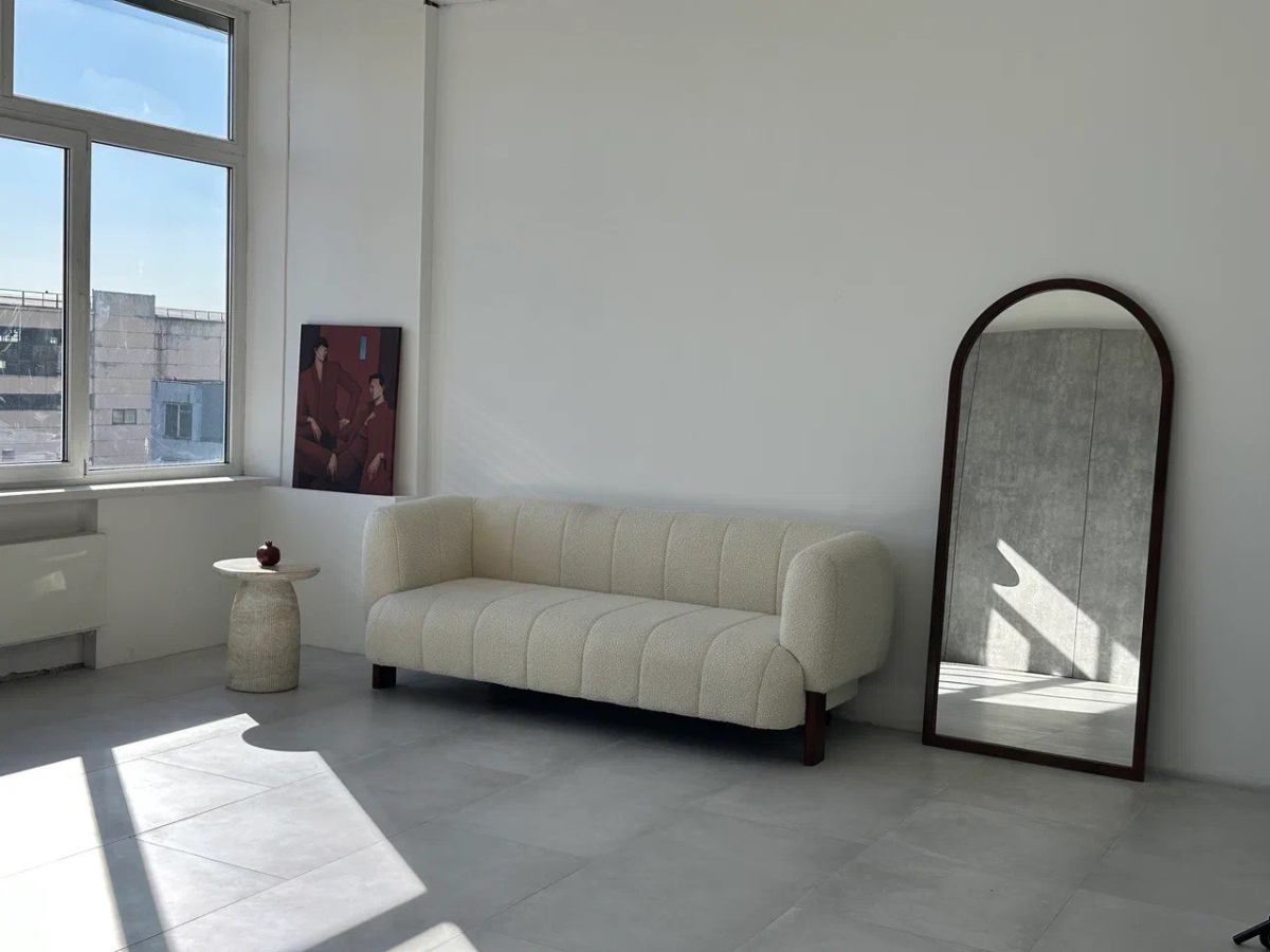 Зал в котором соединились бетон и дерево! Серая стена со вставкой стеклоблоков идеально подойдёт для съёмок на маркет плейс и фешн съёмок! В зале находятся: диван с деревянными эллемантами, дизайнерское кресло, каменный столик , зеркало арка и самый фотогеничный...