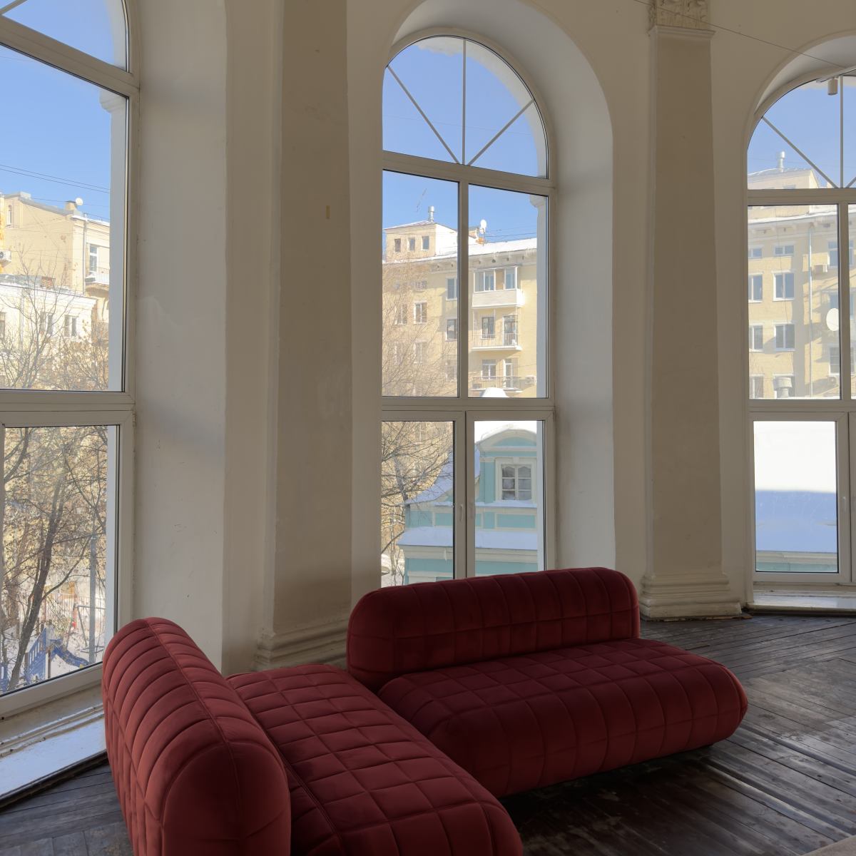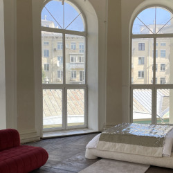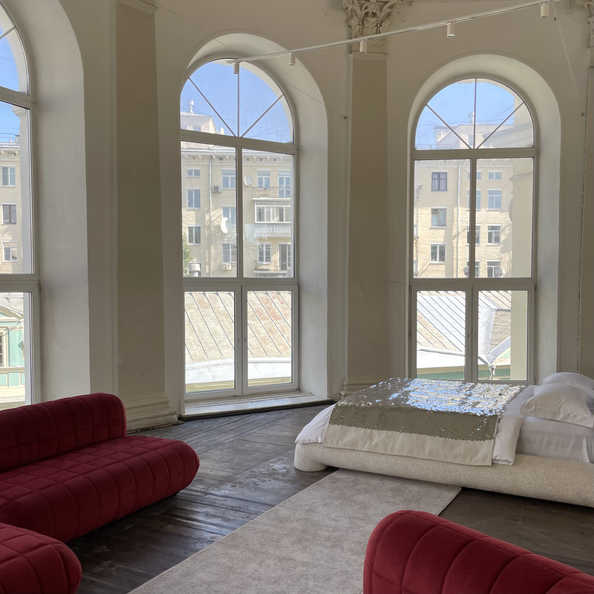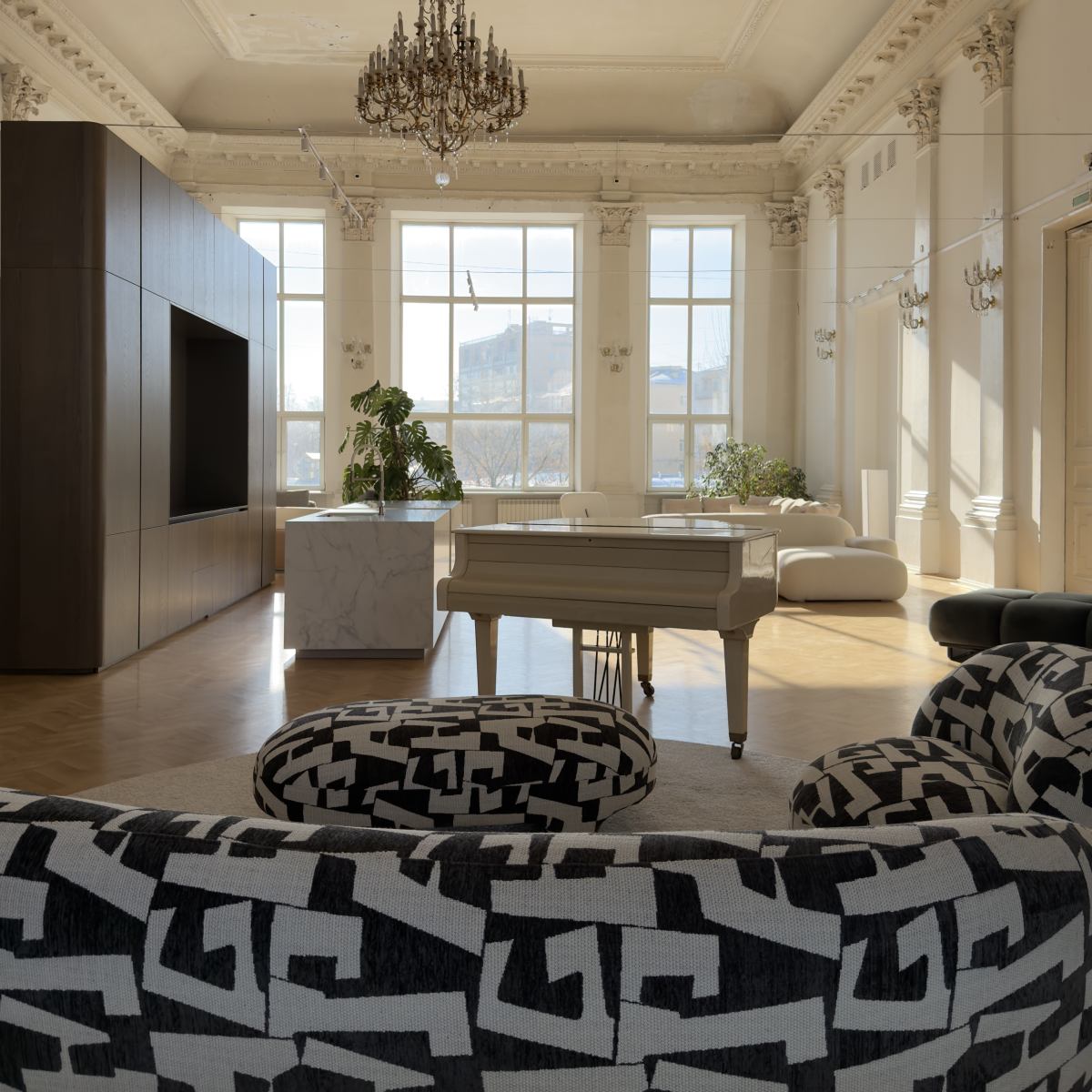 Дизайнерская мебель, высокие потолки 8м с исторической лепниной, эркерные окна в пол, старинный паркет и двери, общая площадь пространства 260м!