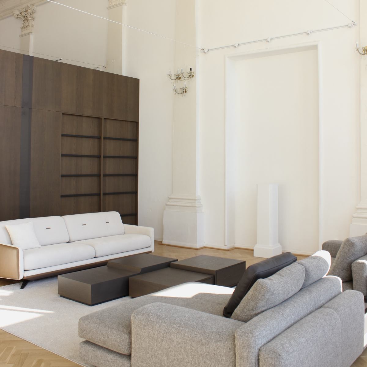 Зал Галерея историческое пространство с паркетом, лепниной, эркерными окнами в пол и современной мебелью.