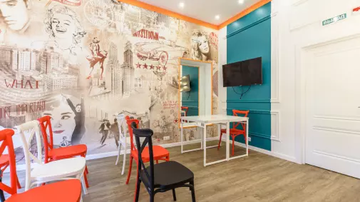 Просторный зал - 17 м2, подойдет для съёмок и проведения мероприятий, вместимость до 15 человек. дизайнерский интерьер, высокие потолки, телевизор.