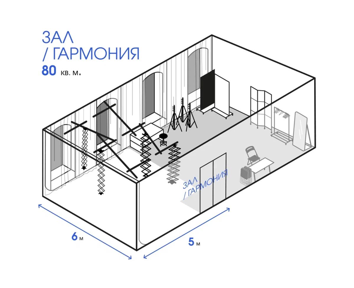Площадь зала 80м2. Высота потолков 4.2 м. Циклорама с подогревом 6х5 метра.