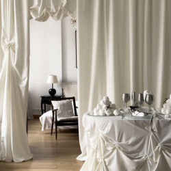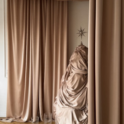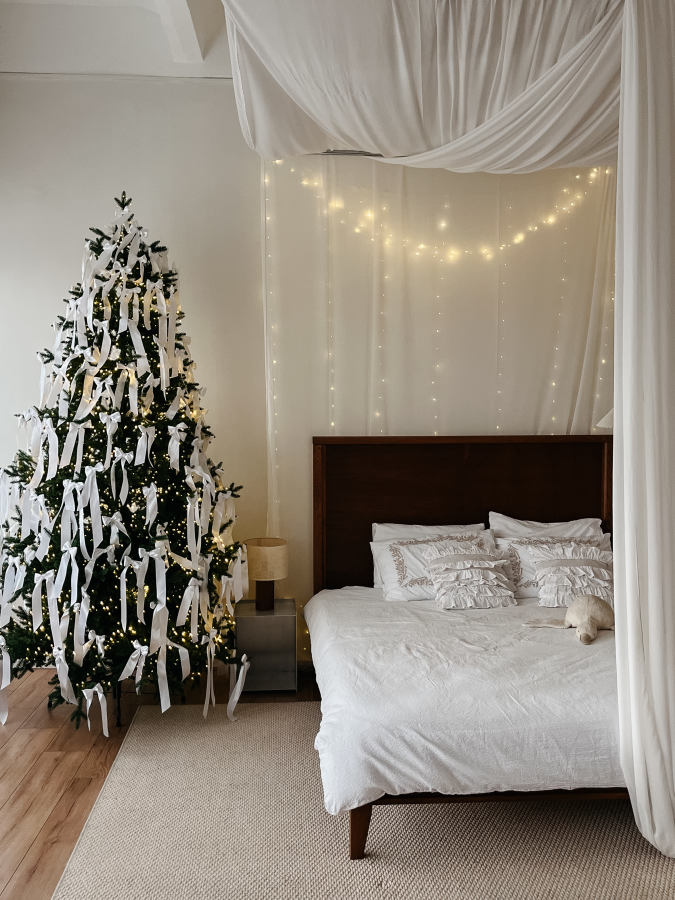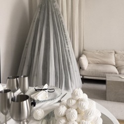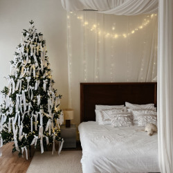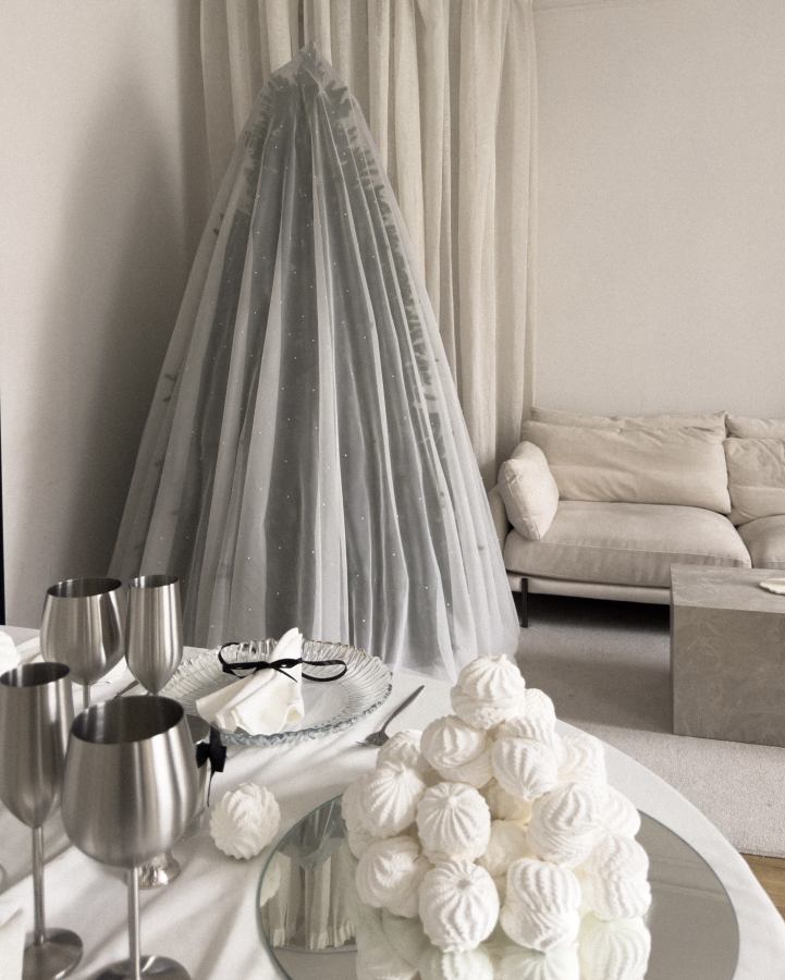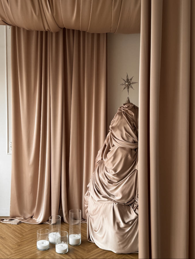Мерцающая ёлка под лёгкой вуалью создаёт ощущение волшебства, а нежные драпировки наполняют пространство уютом .