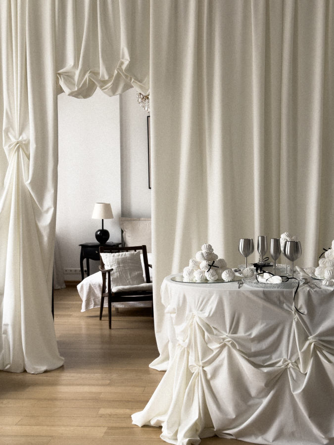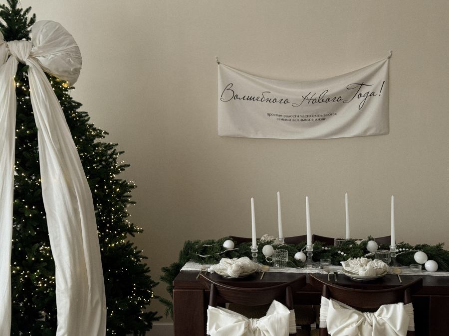 Воздушная ель с огромным белым бантом, элегантная сервировка, мягкие ткани и лёгкое сияние гирлянд создают атмосферу нежного зимнего утра. Идеальный интерьер для семейных, романтических и минималистичных контент-съёмок.