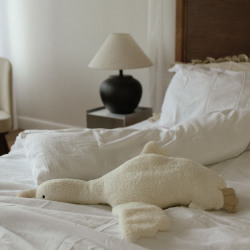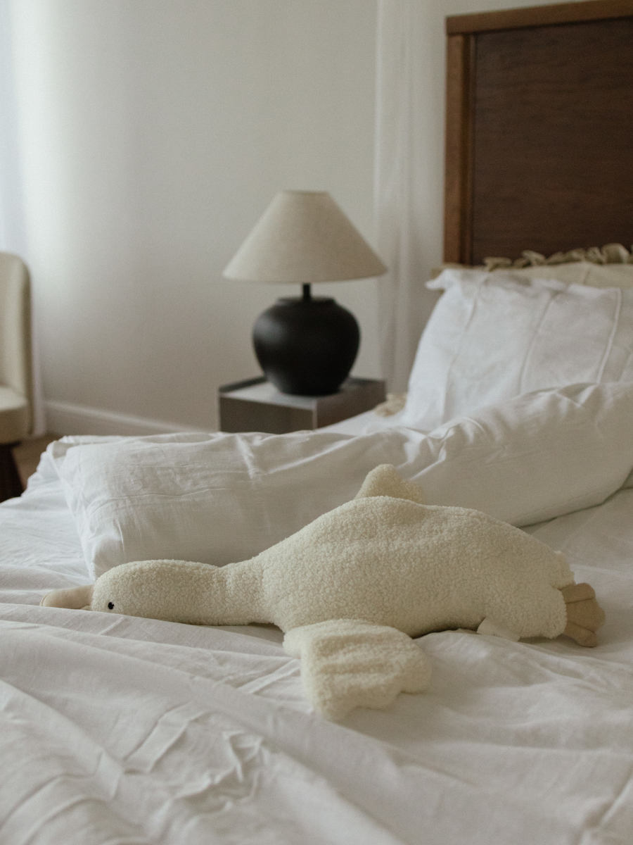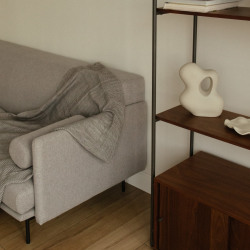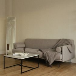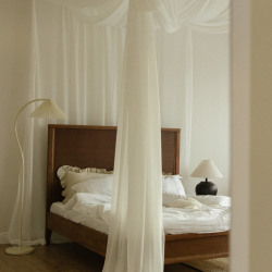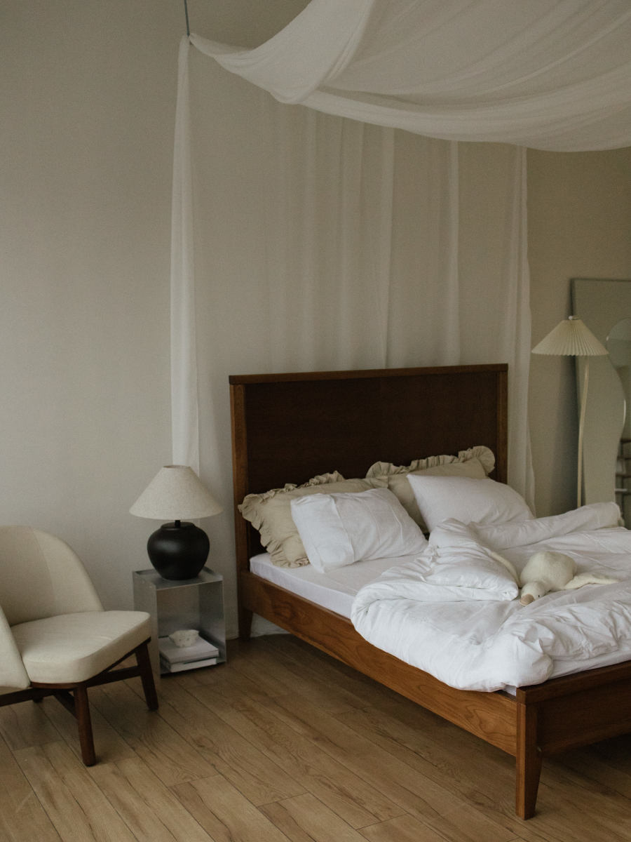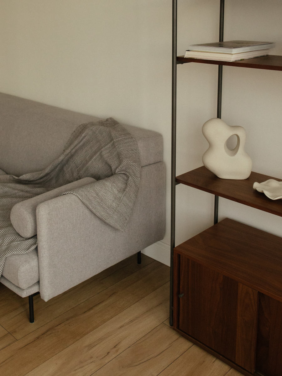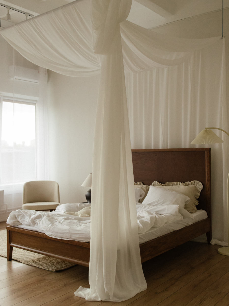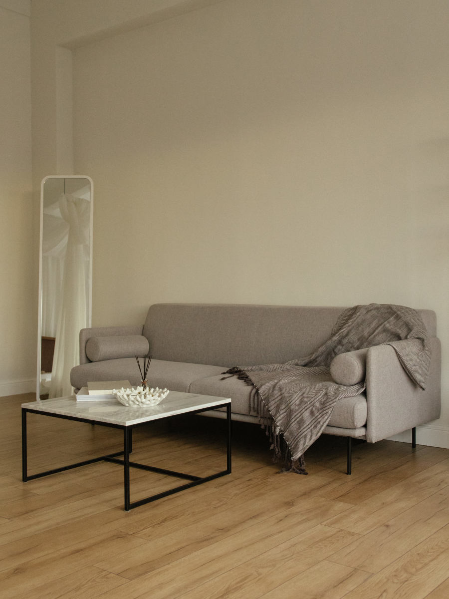 Зал в пастельных тонах с кроватью и серым диваном. Спокойная атмосфера подходит для романтических, семейных и портретных фотосессий, а также модных съёмок