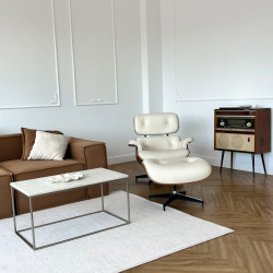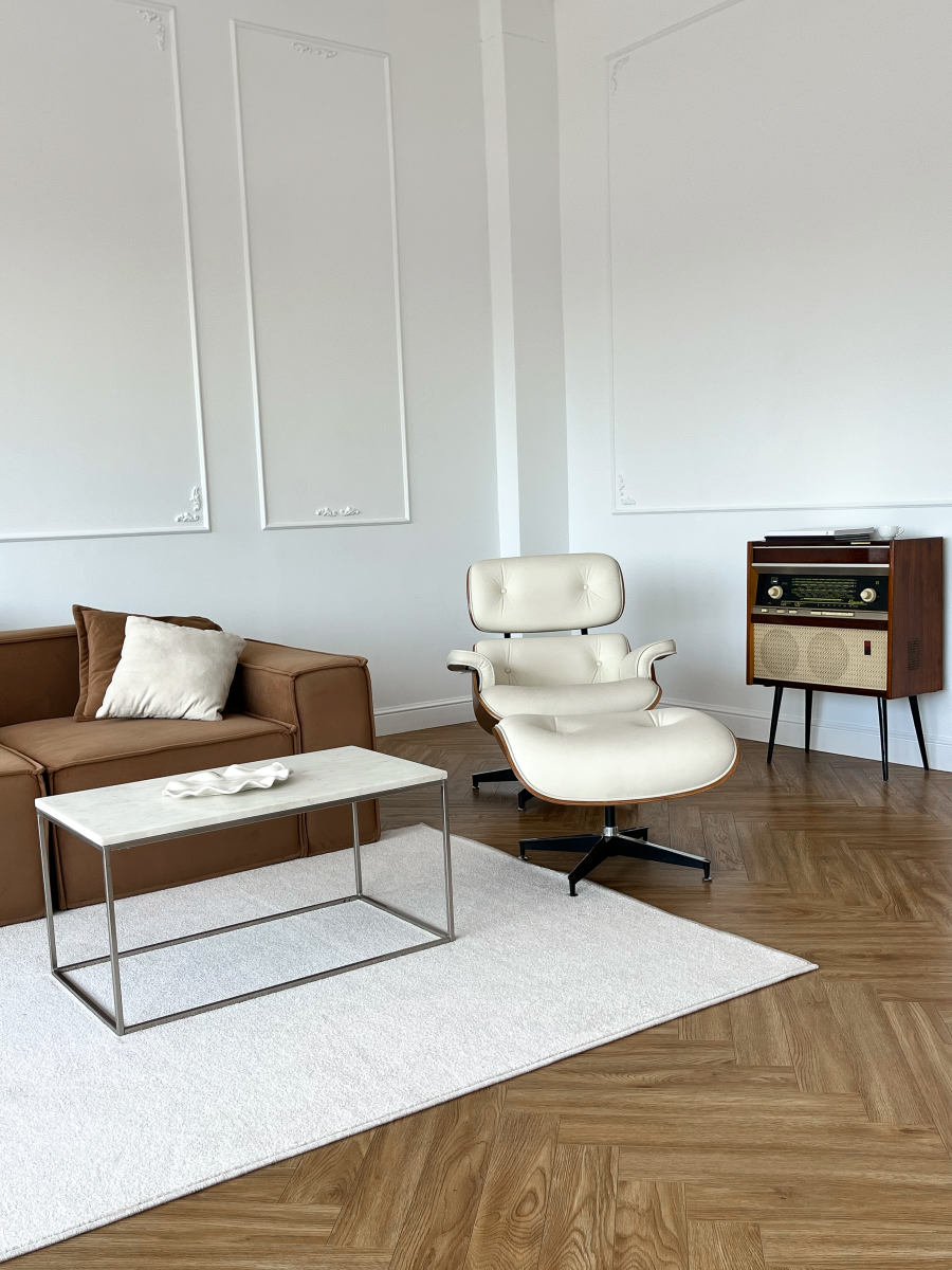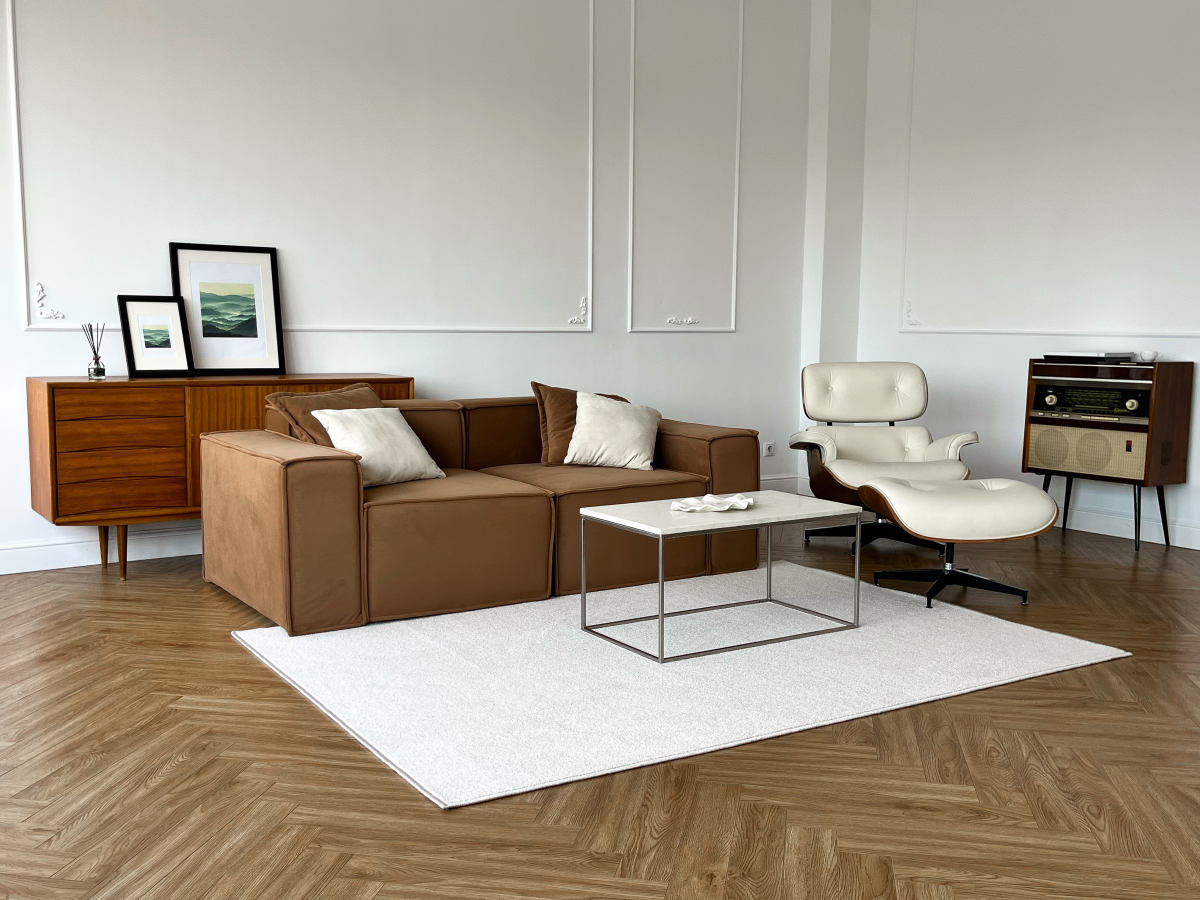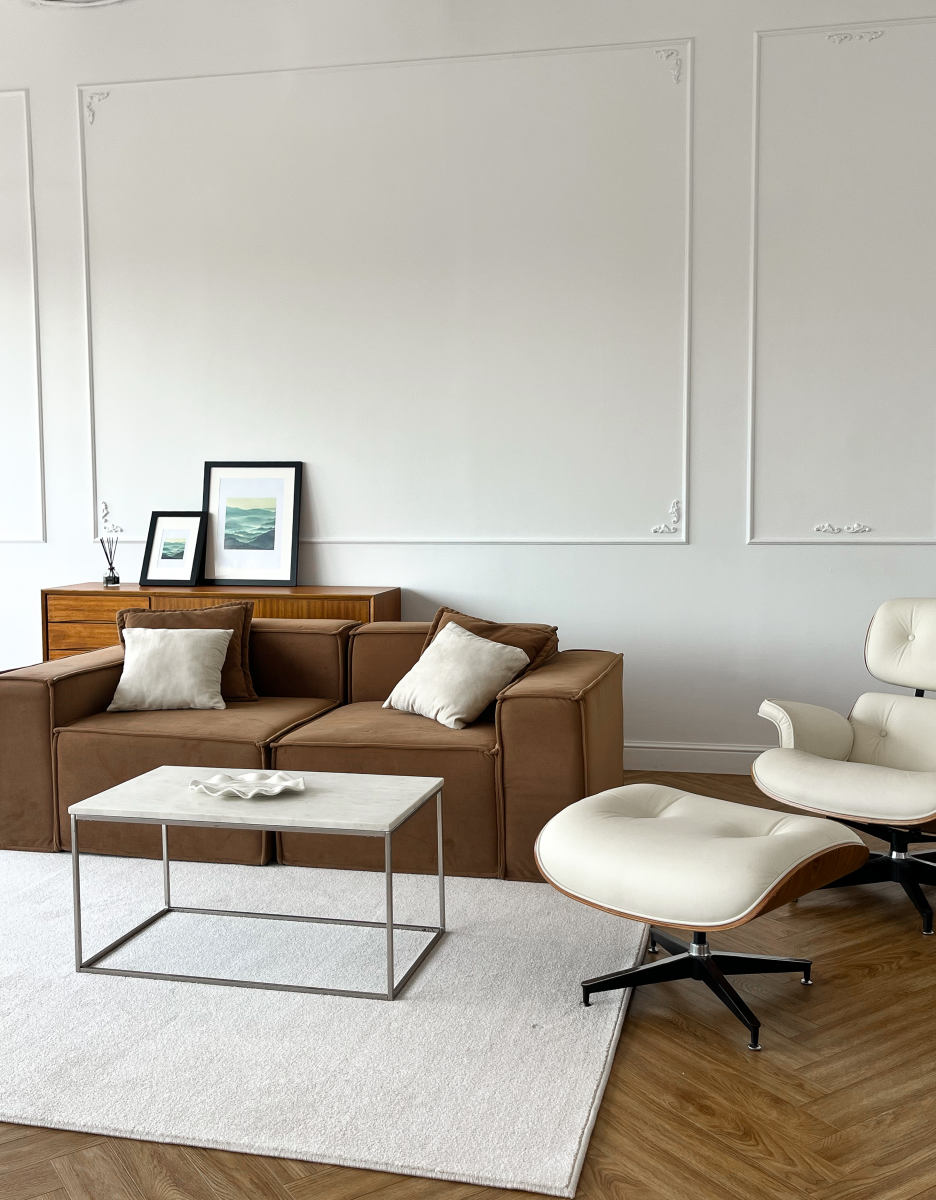 Стильное пространство в тёплой нейтральной гамме. Коричневый диван, белые акценты и простор создают уют. Отличный выбор для портретов, семейных и fashion-съёмок