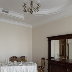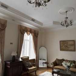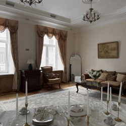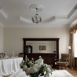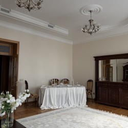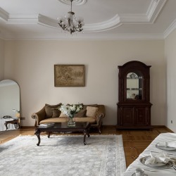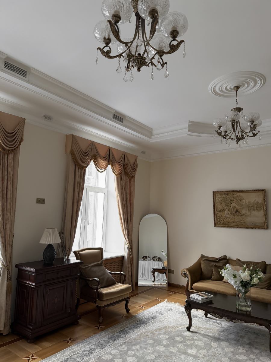 Просторный классический зал с высокими потолками. Светлые стены, большие окна и мебель из темного дерева создают гармоничное и цельное пространство.
