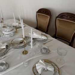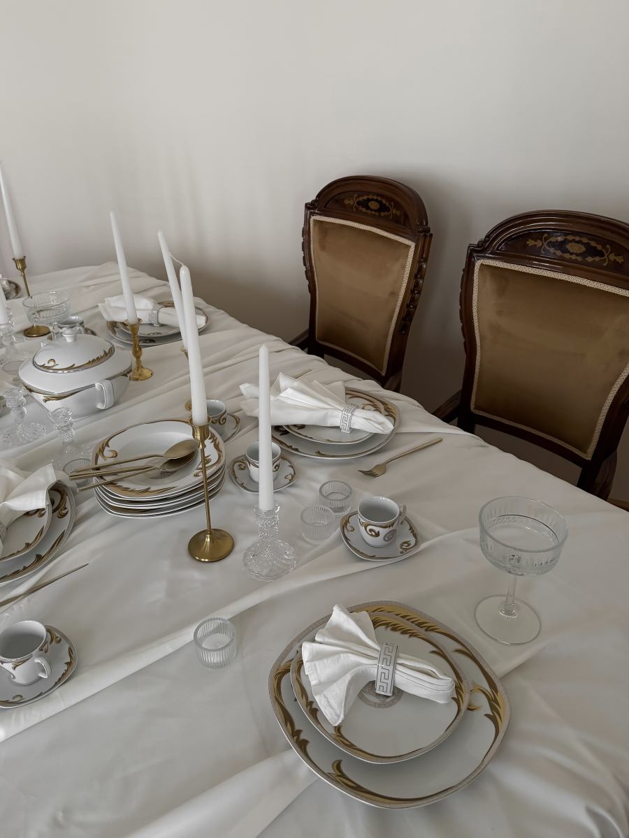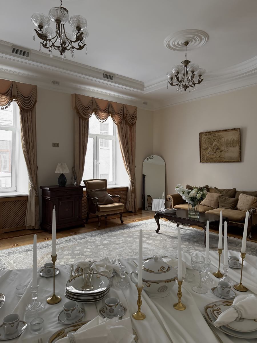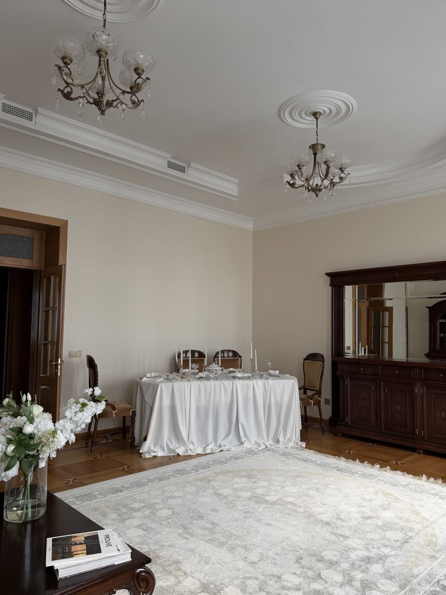 В зале предусмотрены несколько зон: гостиная с диваном и журнальным столом, обеденная группа с сервировкой. Благодаря площади и естественному свету зал подходит как для камерных, так и для более масштабных съемок.