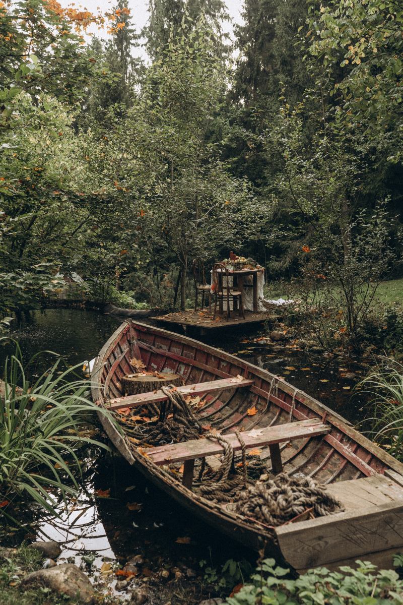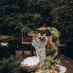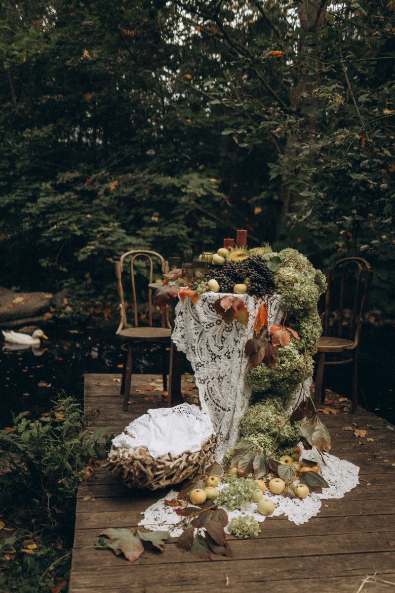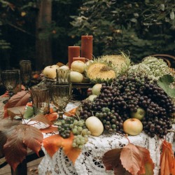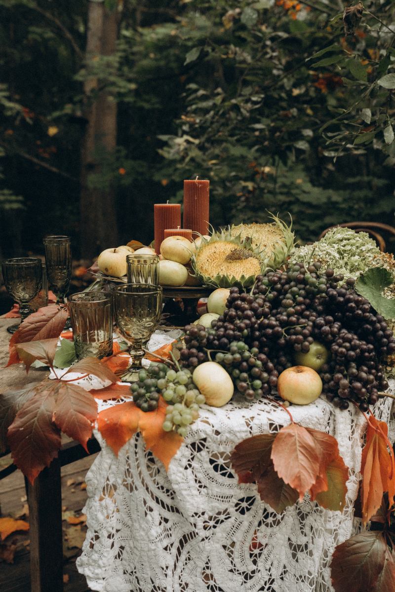 Стол с урожаем, тыквы, яблоки, дикий виноград.