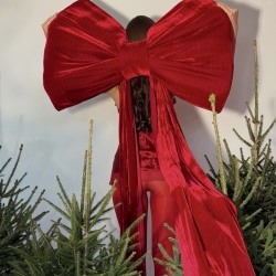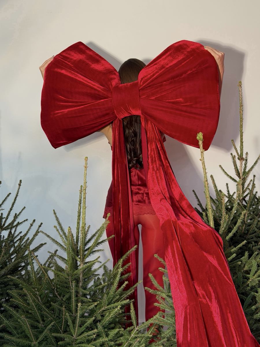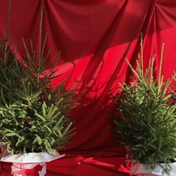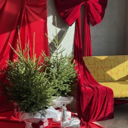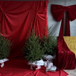 Новогодний декор в зале VIVID 5 маленьких ёлочек с красными бантами, новогодние композиции из еловых и пихтовых веток, бархатные красный бант и красный фон. Свечи и классический новогодний декор для ваших фото и видео проектов. ...