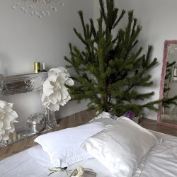 В PURE находится передвижная кровать, которую можно поставить по желанию у любой стены в комнате или у окна. Кровать застелена белым сатиновым постельным бельем. В комнате висит винтажная люстра, а так же стоит зеркало в полный рост и висит