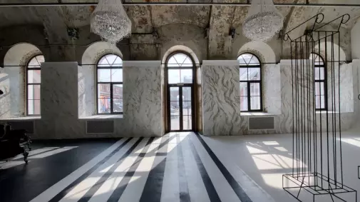Просторный зал с большими окнами и высокими потолками, площадью 110 м2. Данный зал выходит на западную сторону, солнце здесь начинает светить с 14:00 и до самого заката перемещаясь по всему залу.