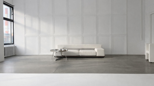 Фактурная серая стена из бетонных плит и светлый бетонный пол — стильный фон для любого проекта.