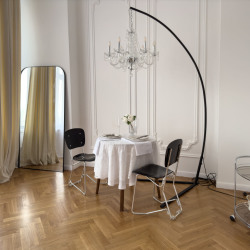 Мебель и реквизит: антикварный комод, трюмо, витрина, небольшой сервировочный стол на 2 персоны, ретро стулья Armin Wirth, винтажный стеклянный сервировочный столик, черное кожаное кресло Баухаус, черный металлический торшер, замшевая софа цвета ириски, черная тумба с настольной лампой Баухаус, ростовое зеркало 180×96 см, рейл для одежды.
