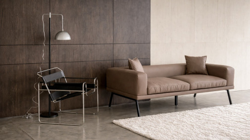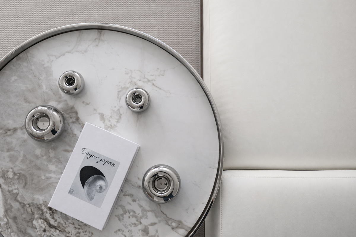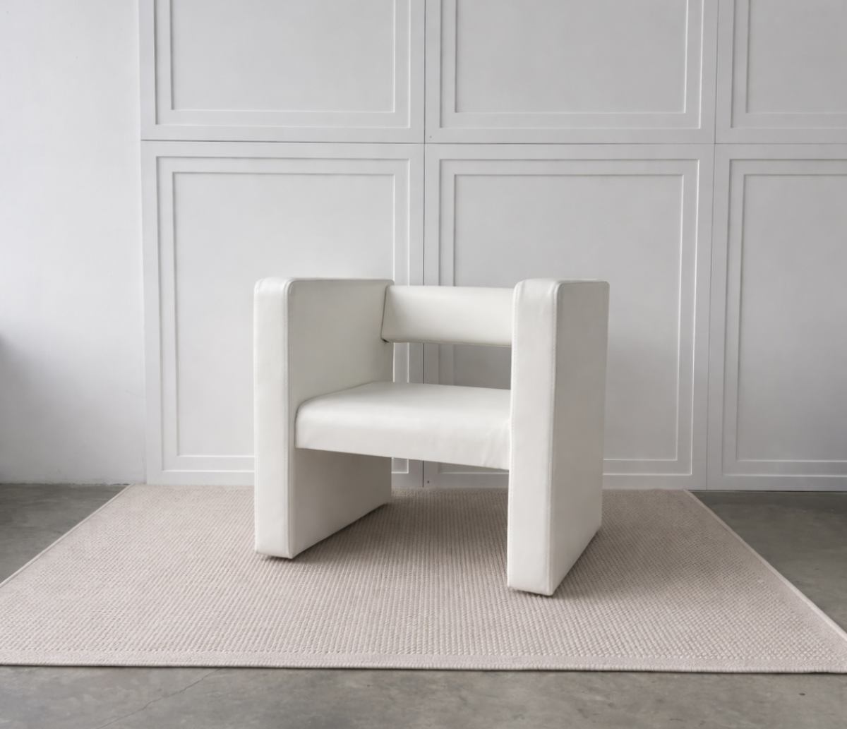 Меблированная зона с белым диваном, креслом, журнальным столиком и ковром