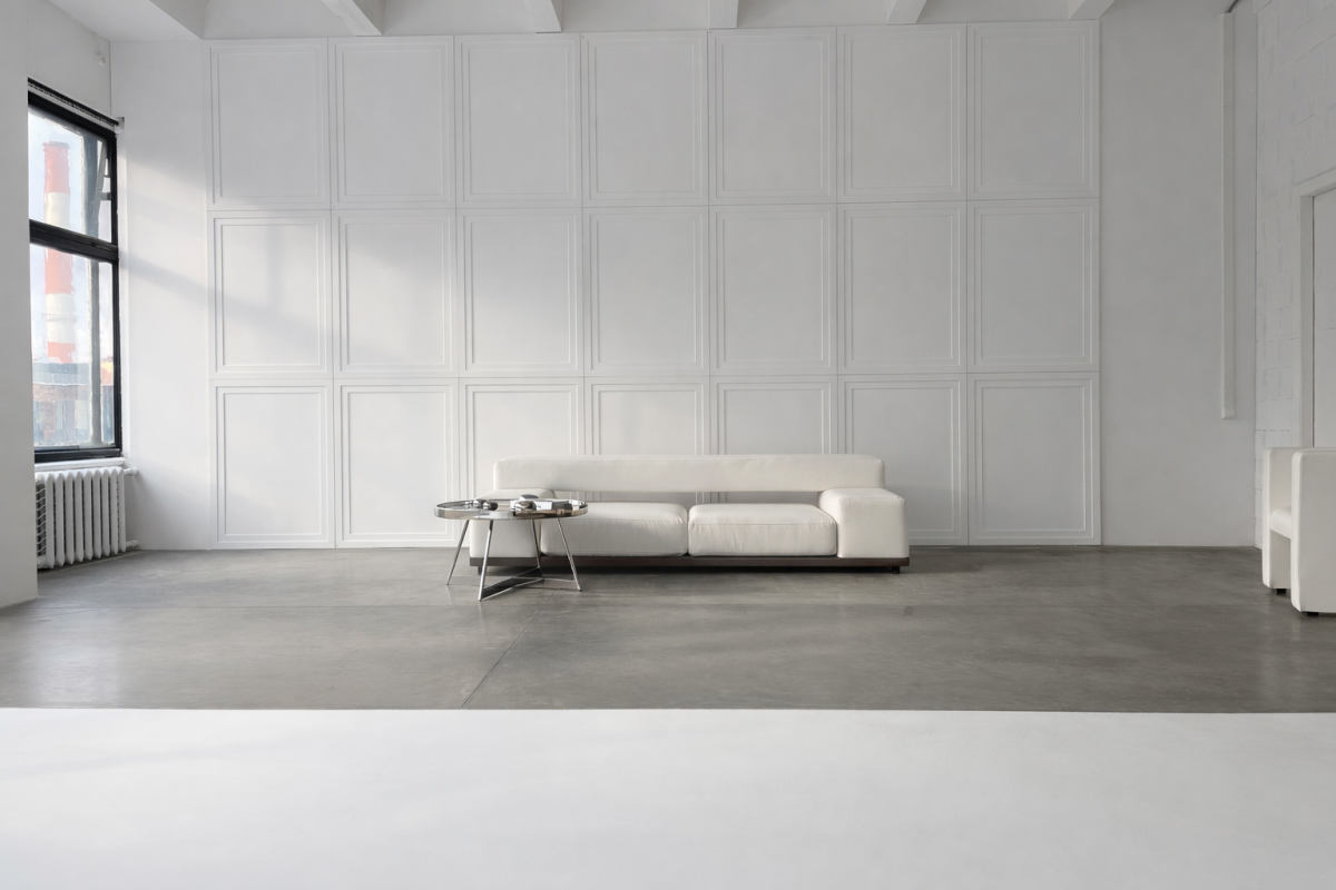 Интерьерная зона с филёнчатой белой стеной и дубовыми панелями. Чистый, архитектурный фон для интерьерных и fashion-кадров.