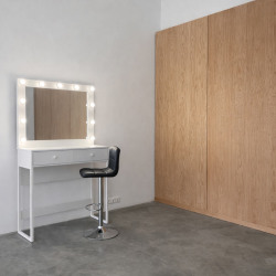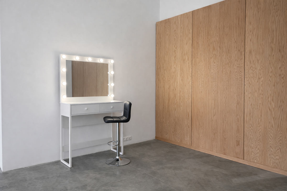 белый диван, кресло, журнальный столик, ковёр, ростовое зеркало, рейл для одежды, гримёрный стол, технический стол, импульсный свет Profoto.