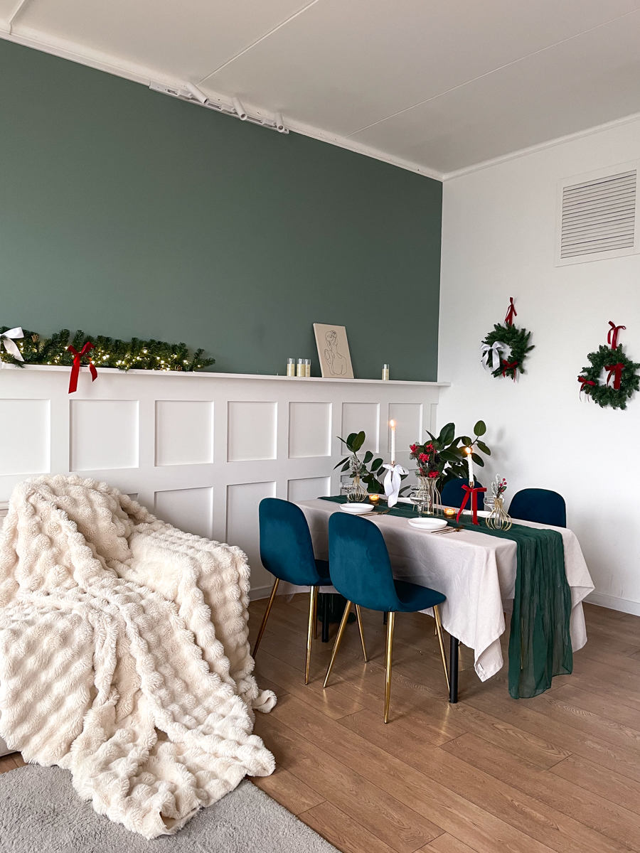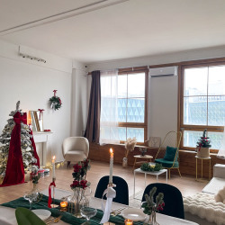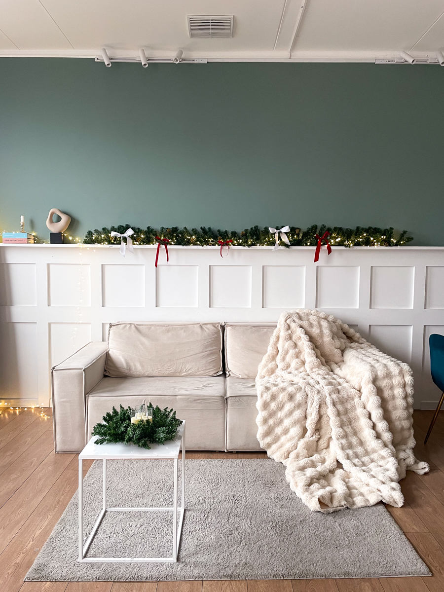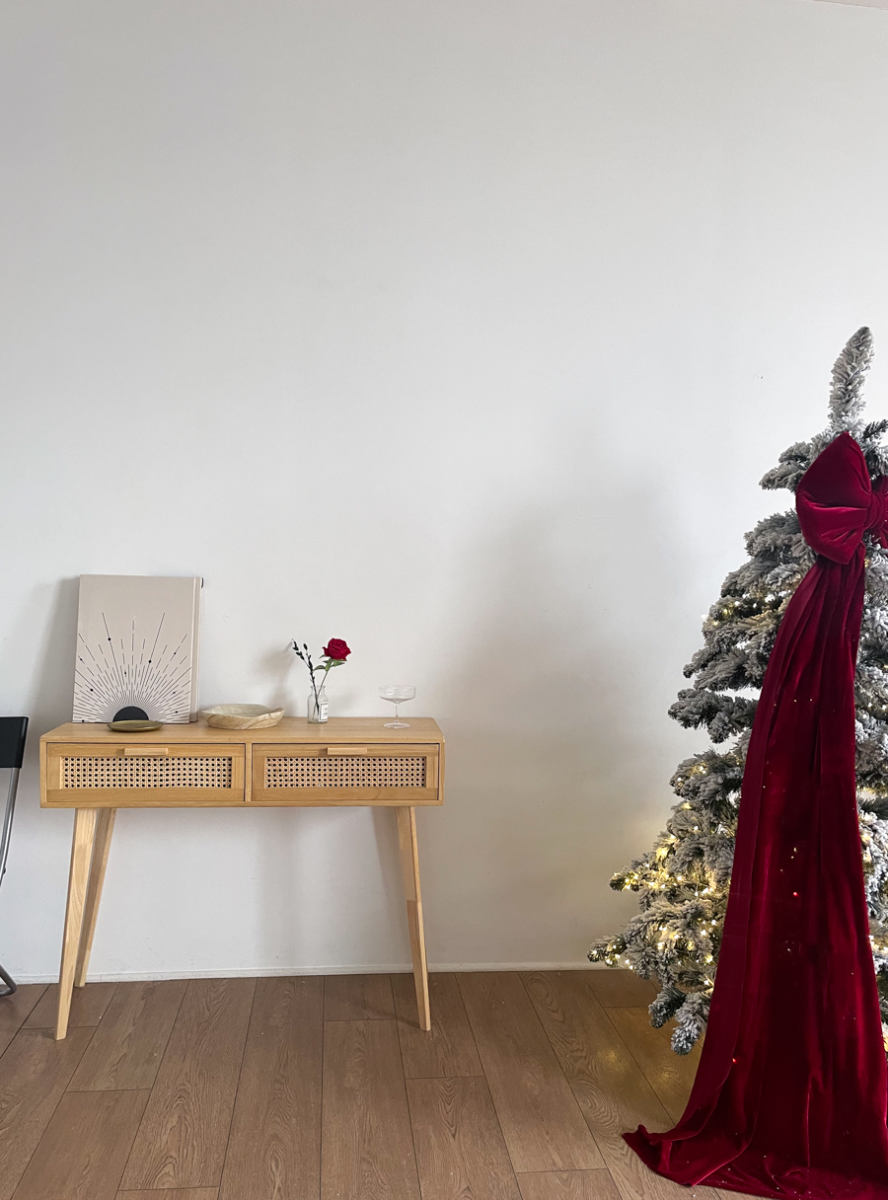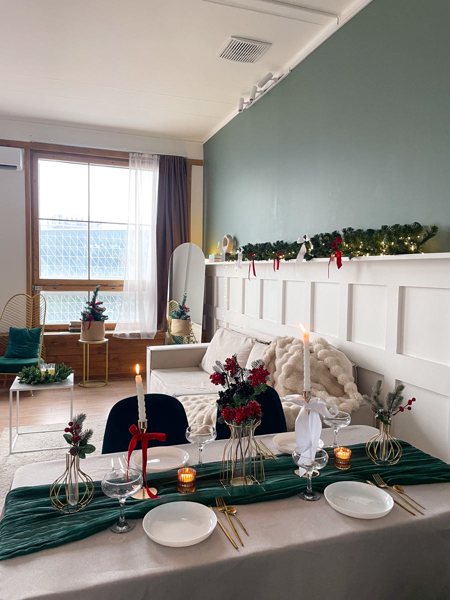 Заснеженная елка с красным бантом и множество новогодних элементом минималистично украшающих зал)Забронировать зал: https://photozall.ru/apart...