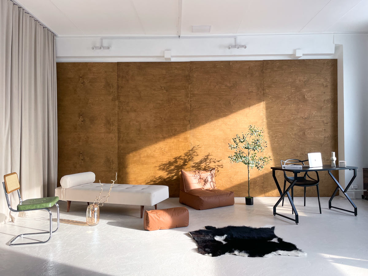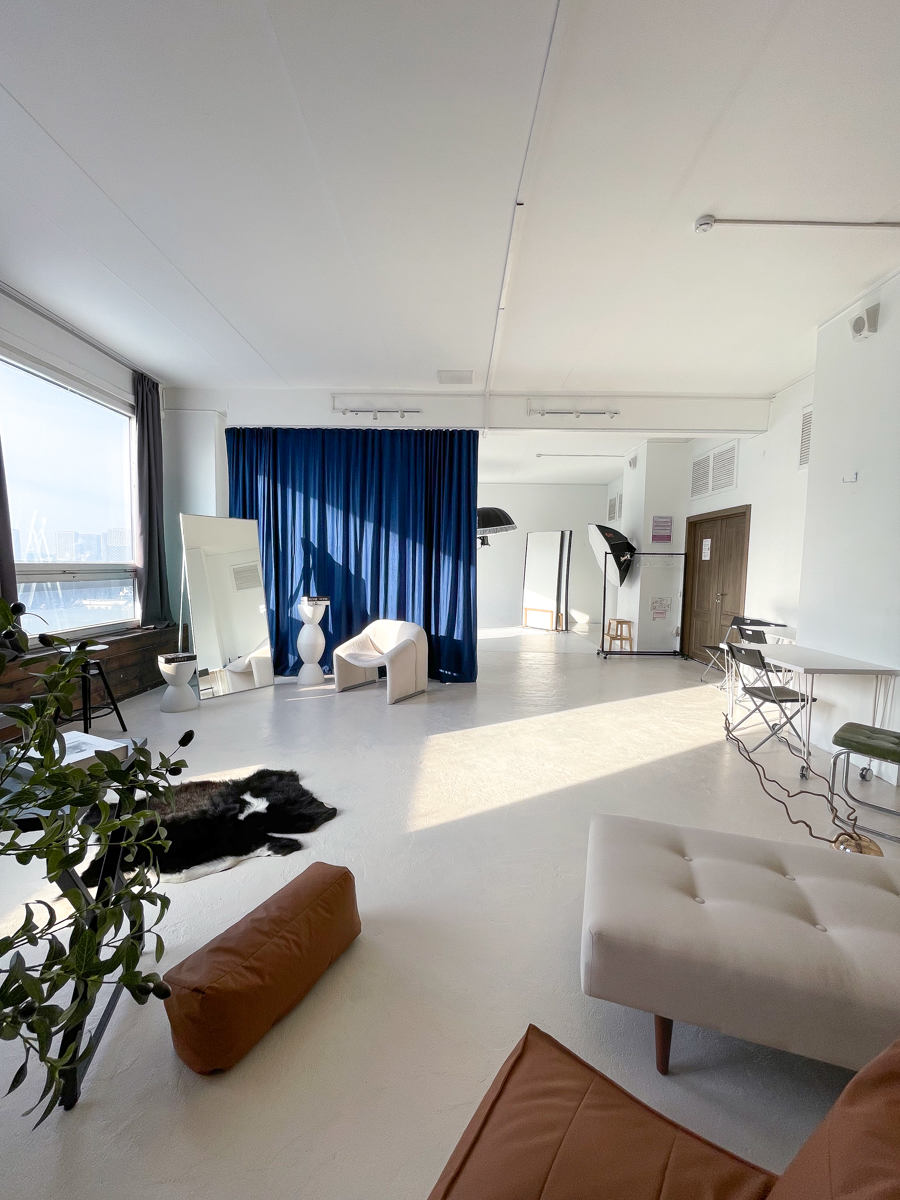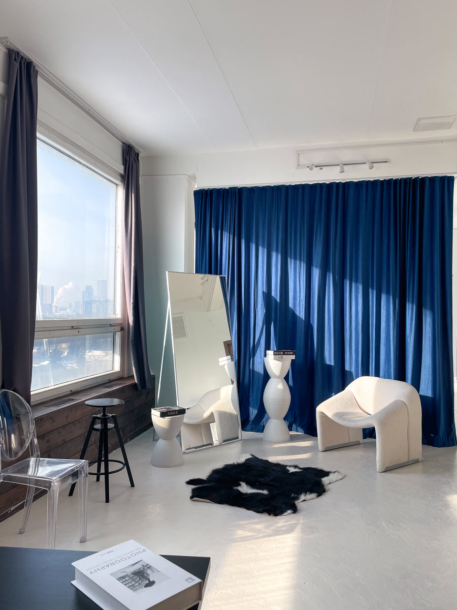 Зал «Серебро» локация для коммерческих, рекламных и творческих съемок, индивидуальные фотосессии и записи видео. Импульсный свет Godox, циклорама, интерьерная зона с мебелью, панорамные окна, много естественного света.