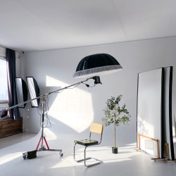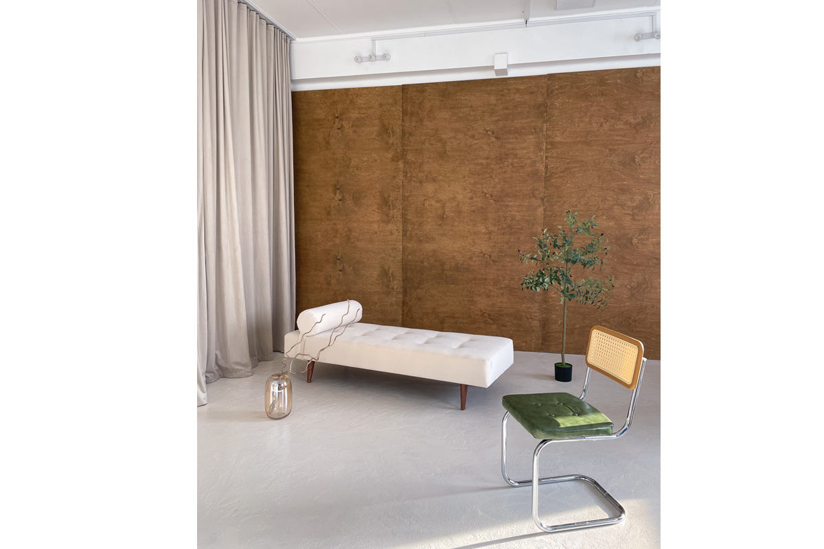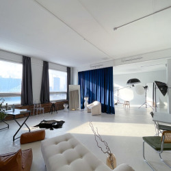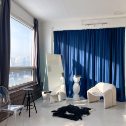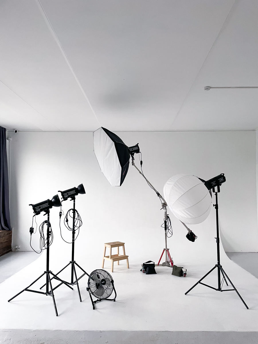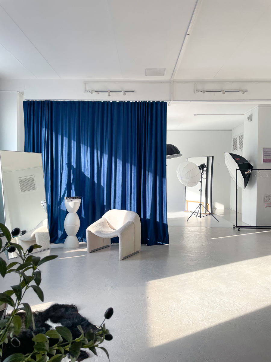 Зал «Серебро» локация для коммерческих, рекламных и творческих съемок, индивидуальные фотосессии и записи видео. Импульсный свет Godox, циклорама, интерьерная зона с мебелью, панорамные окна, много естественного света.