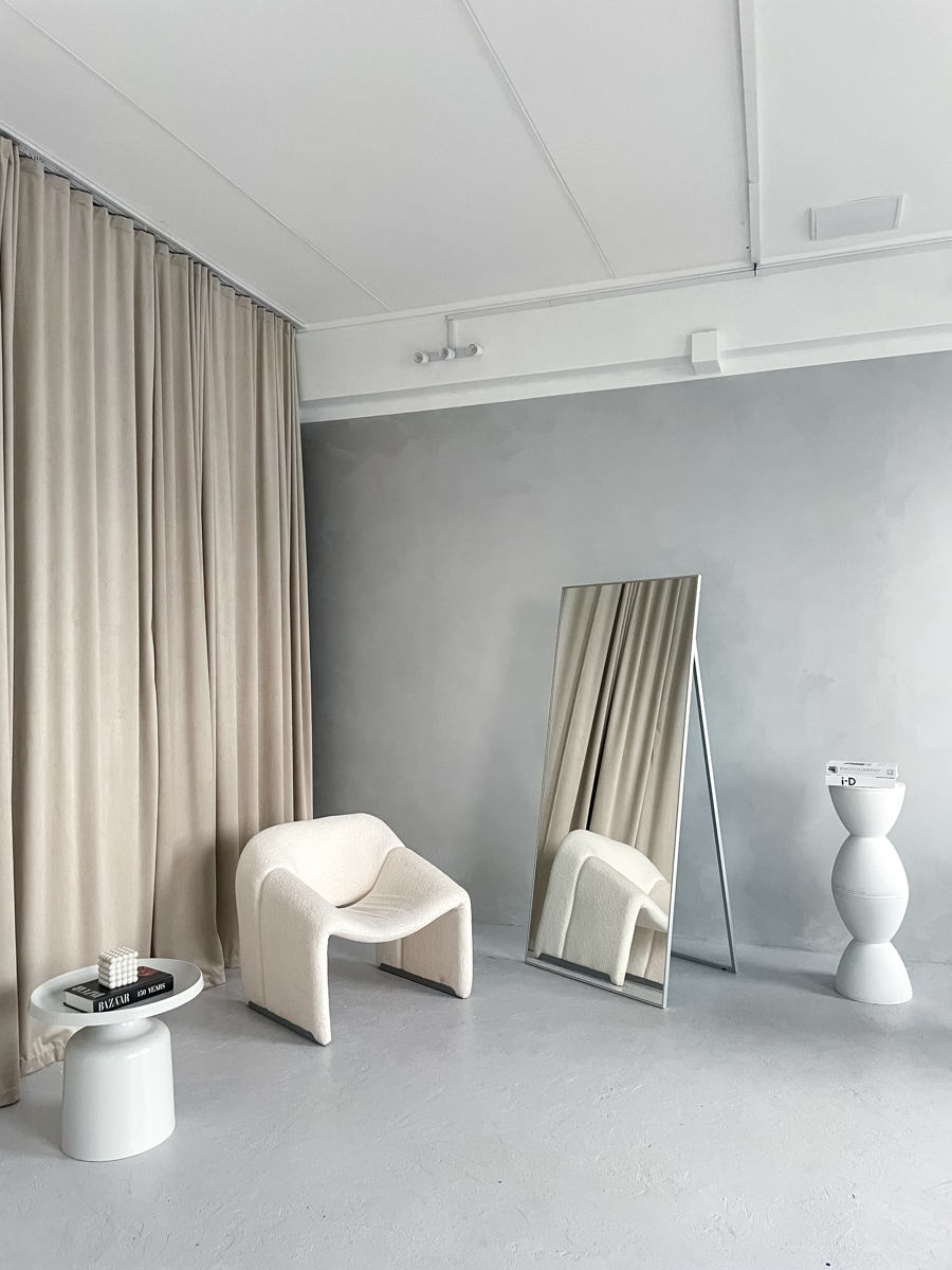 -кресло, столик, белые пуфы, декор, ростовое зеркало, ваза,