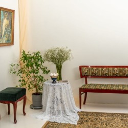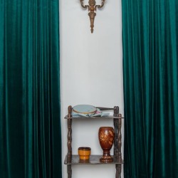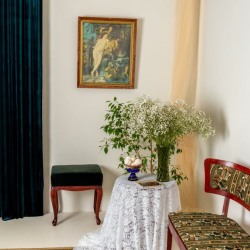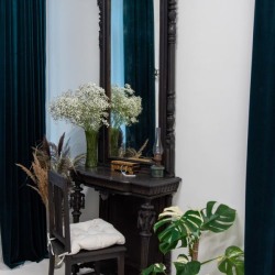Раритетная мебель: элегантная банкетка, мягкий пуфик и резной стул — каждый предмет с собственной историей.Зелёный бархат на окнах и шерстяной ковер на полу создают ощущение камерности и уюта.На всех окнах шторы blackout.