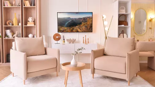Светлое помещение для разных видов съёмок: портретных, интерьерных и контента. В зале белый пол, белые и бежевые стены.