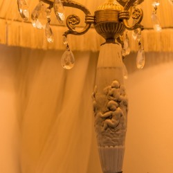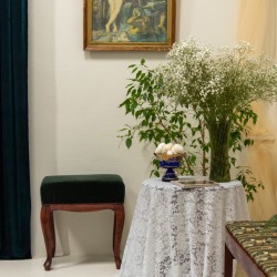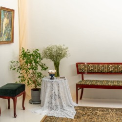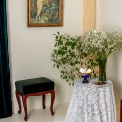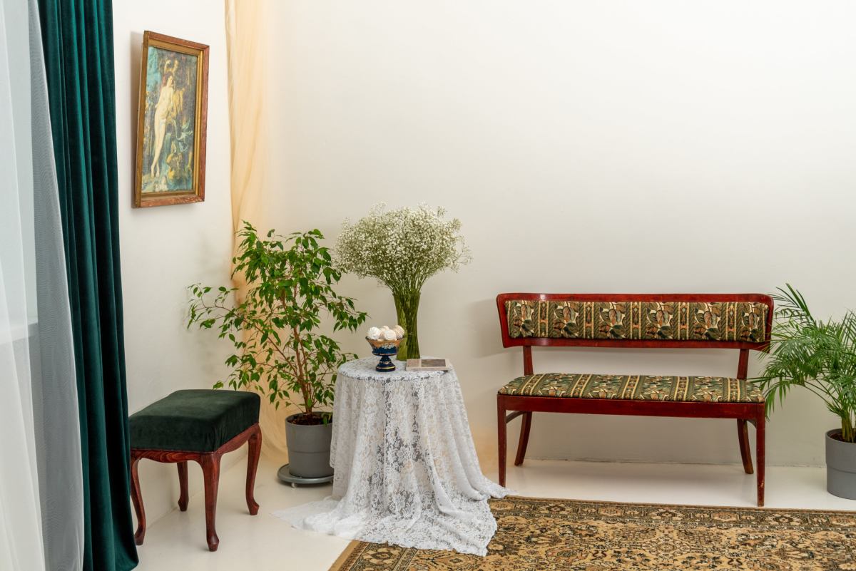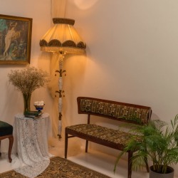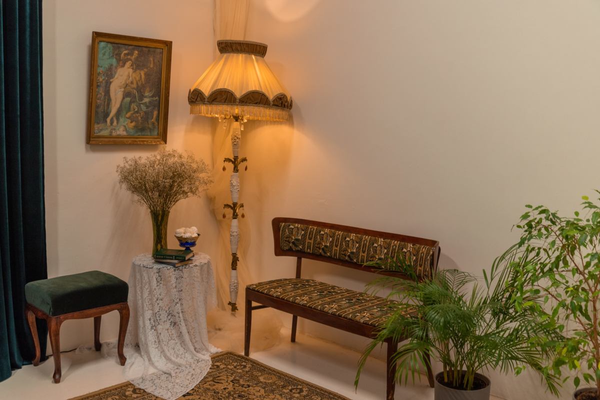 Раритетная мебель: элегантная банкетка, мягкий пуфик, бронзовый торшер и резной стул — каждый предмет с собственной историей.