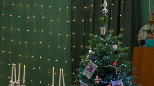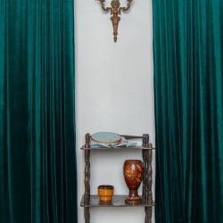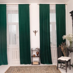 Зелёный бархат на окнах и шерстяной ковер на полу создают ощущение камерности и уюта.