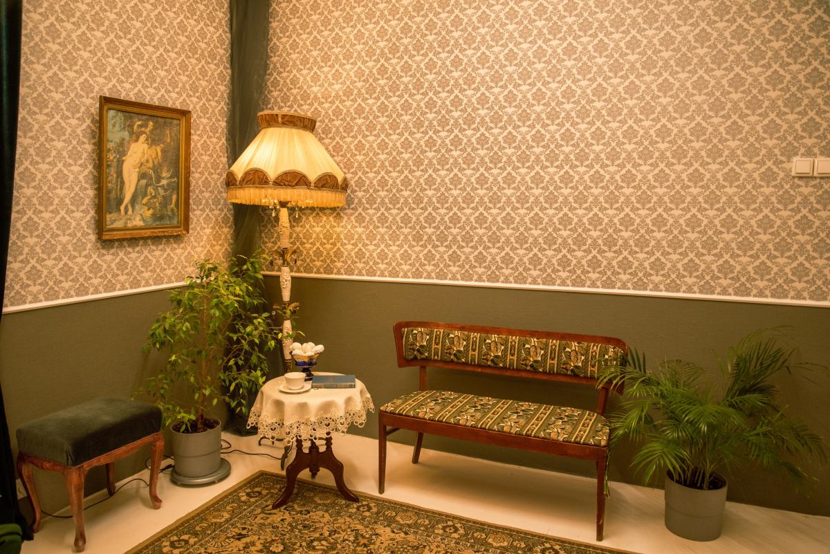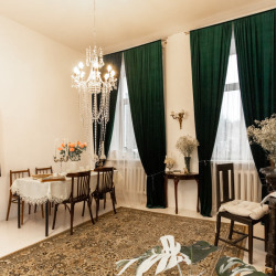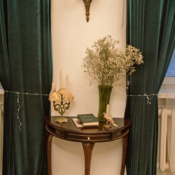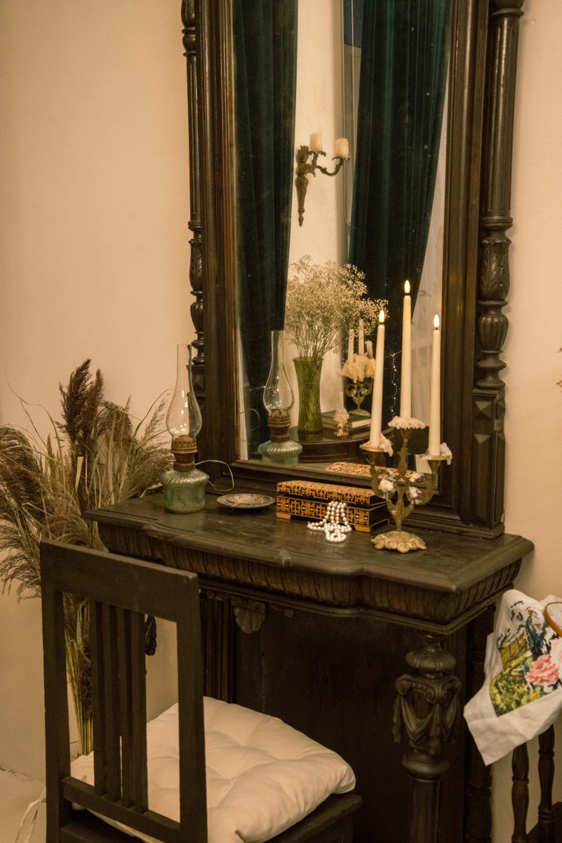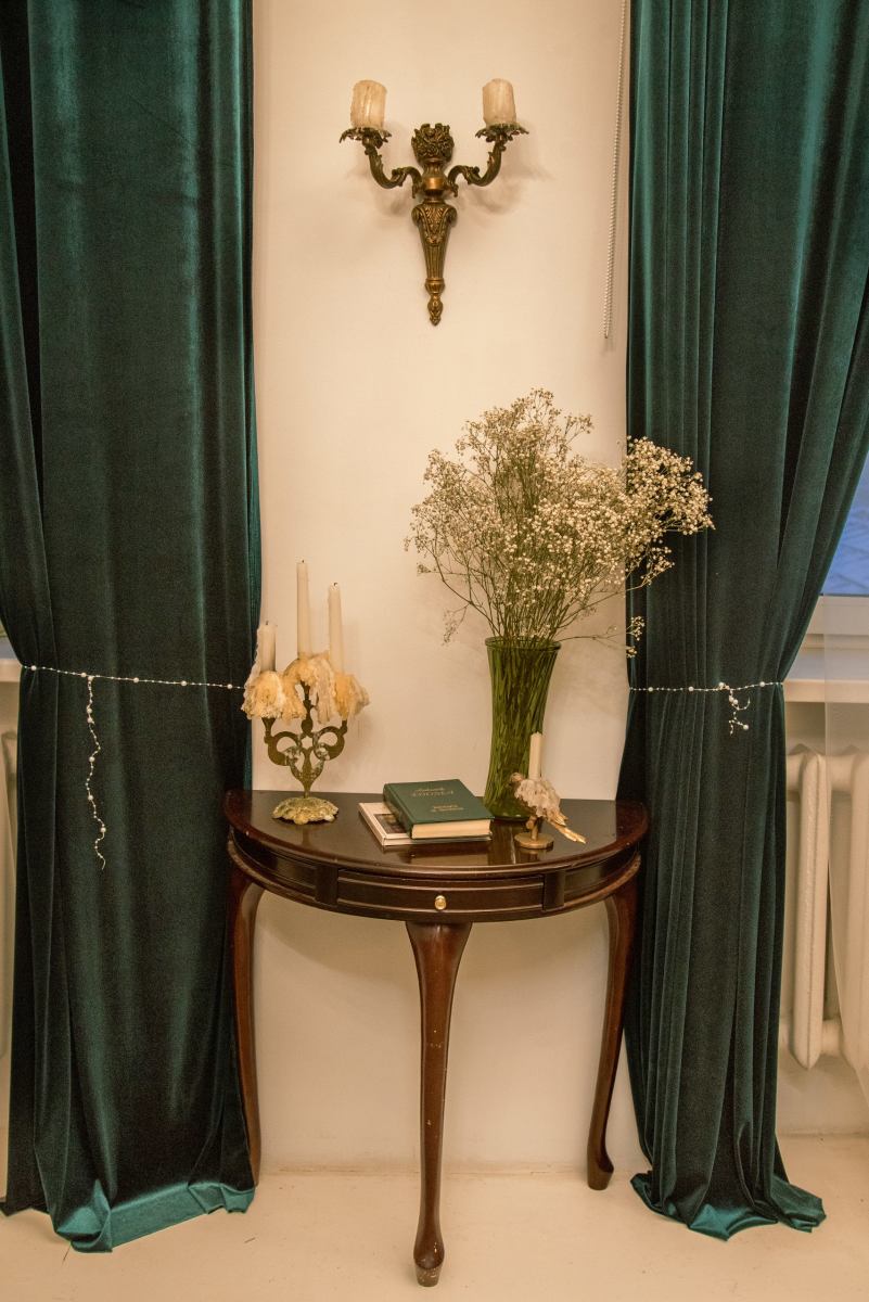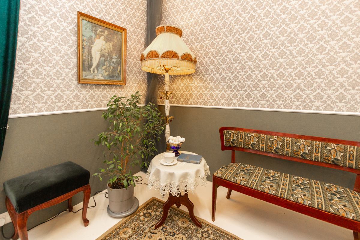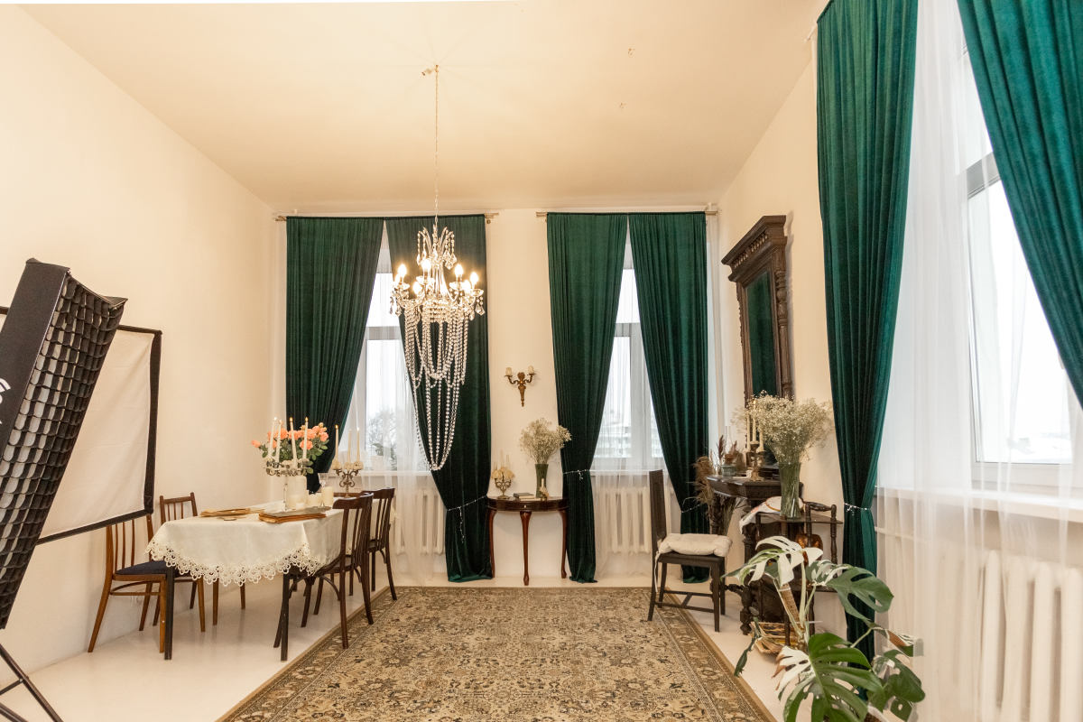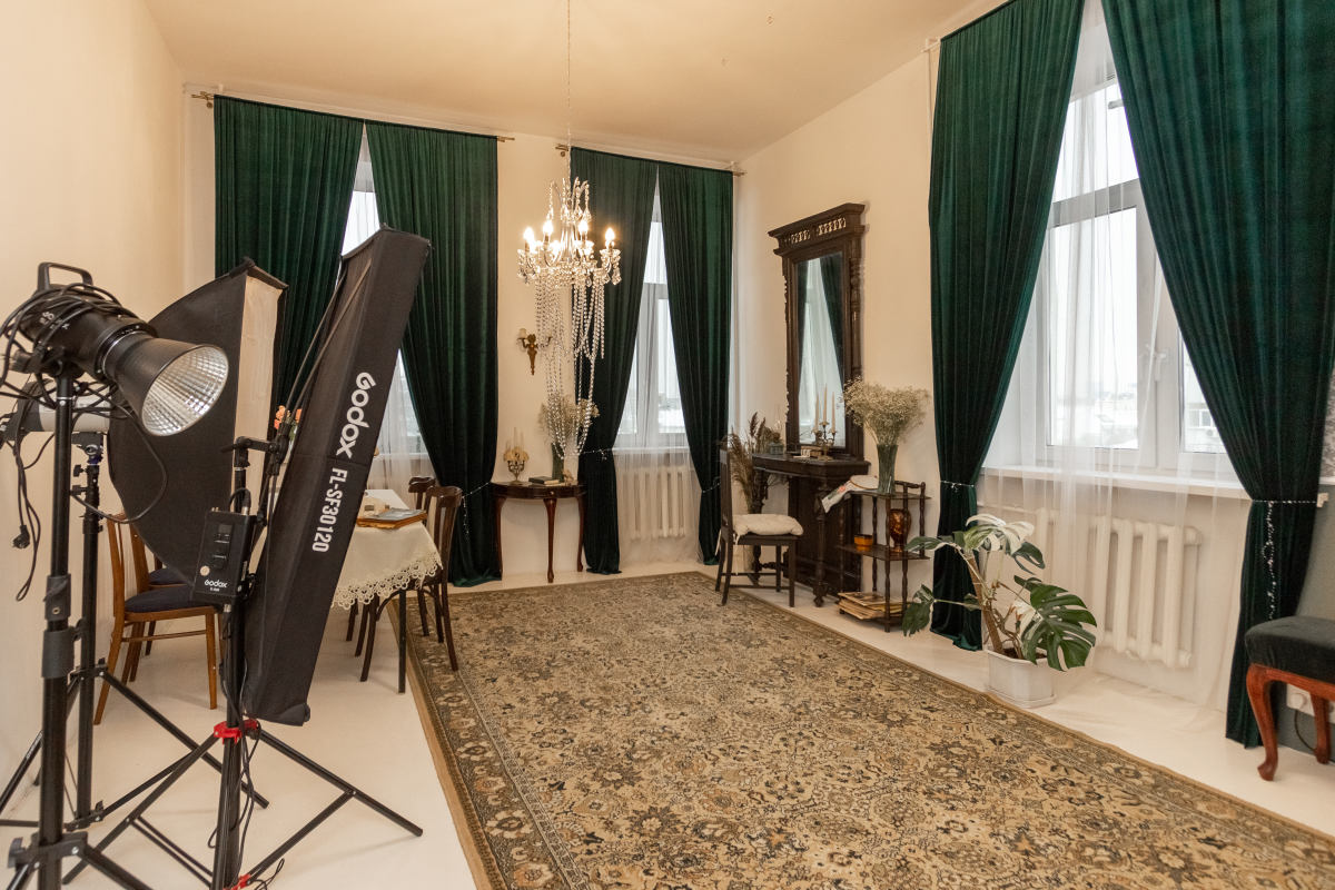 Винтажный зал с раритетной мебелью. Белый пол, белые и бежевые стены, шторы blackout на всех окнах. Старинное зеркало XIX века — главный акцент пространства, придающий ему исторический шарм и глубину. Раритетная мебель: элегантная банкетка, мягкий пуфик, стол со свечами, ламберный столик, резной стул и шикарная хрустальная люстра — каждый предмет с собственной историей. Зелёный бархат на окнах и шерстяной ковер на полу создают ощущение уюта. Раритетный торшер бронза, керамика и теплый свет сделают вашу съемку по настоящему камерной. Подходит для съёмок контента и одежды для брендов,маркетплэйсов, актёрского и модельного портфолио. Всегда доступны постоянный свет Godox Fl150R, комплект импульсного света Hensel и кольцевая лампа. Площадь: 25 м² Бронь от 1 часа