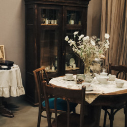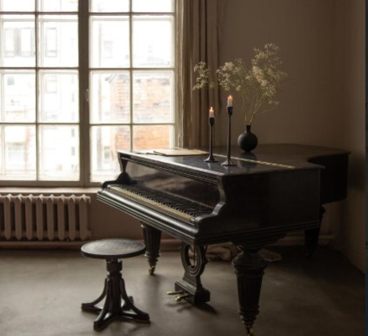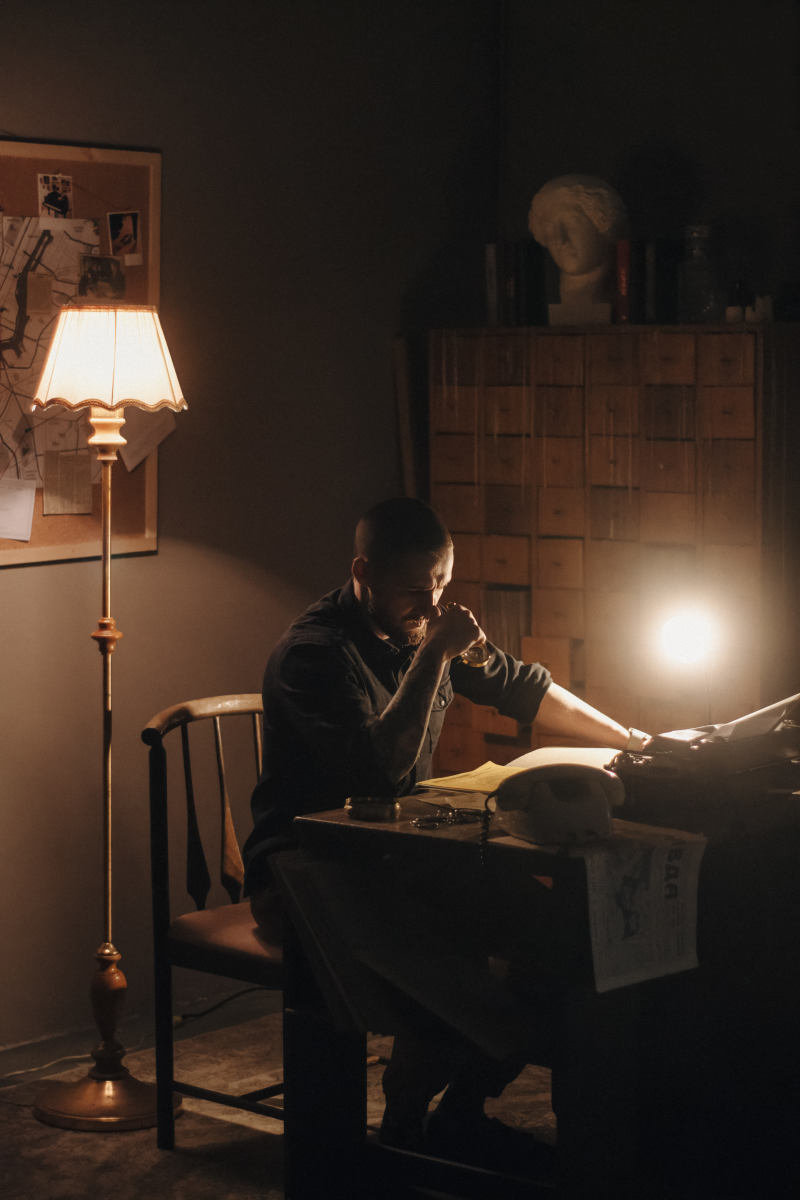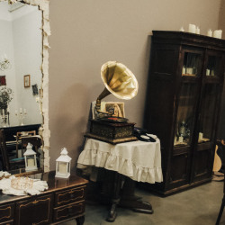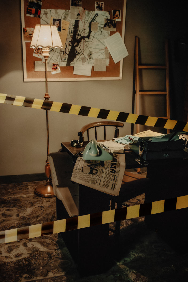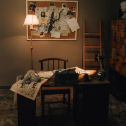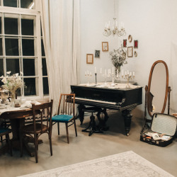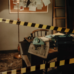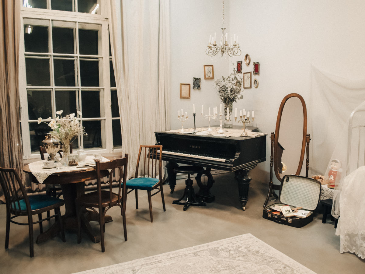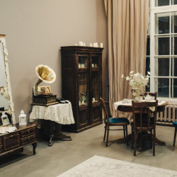 Интерьер: рояль, граммофон, гитара, 2 стола, стулья, 3 чемодана, шкаф, ваза с сухоцветами, чайный сервиз, свечи на батарейках, ноты, люстра со свечами, стульчик для рояля, пластинки, напольное зеркало в полный рост, напольное зеркало средник размеров, маленькое настенное зеркало, канделябры со свечами, картотека, гипсовая голова, ветки деревьев, картины на стенах, рабочий стол, доска с уликами, торшер, печатная машинка.