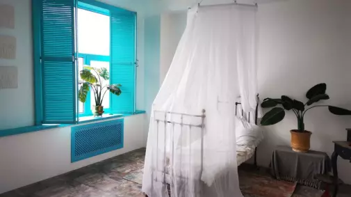 9. Комната с кроватью и ванной на потолке облака