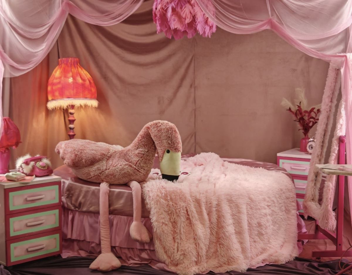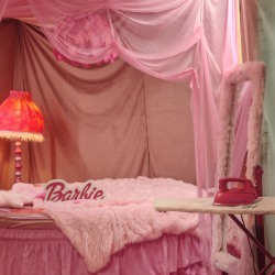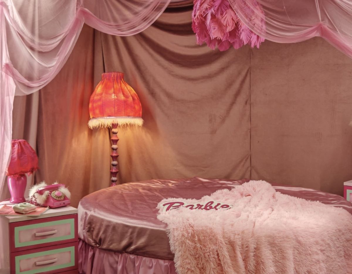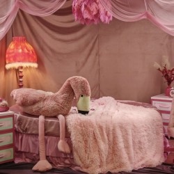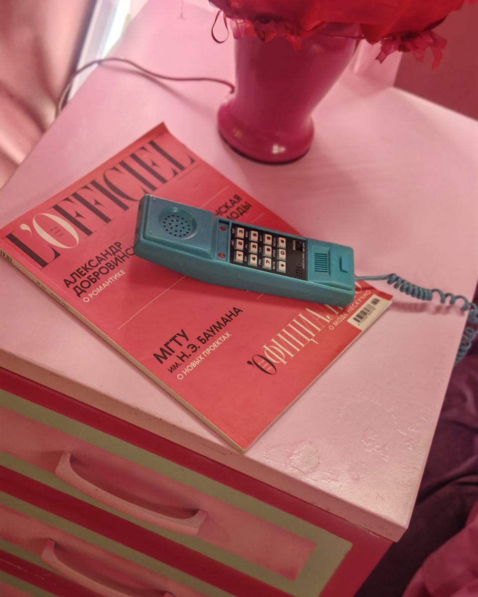 круглая Кровать, торшер, тумбы, шторы, подушки, ретро телефон розовый, будильник, одежда для локации