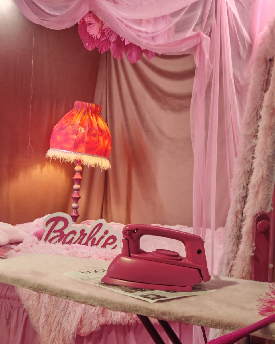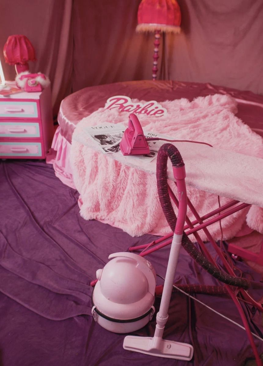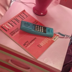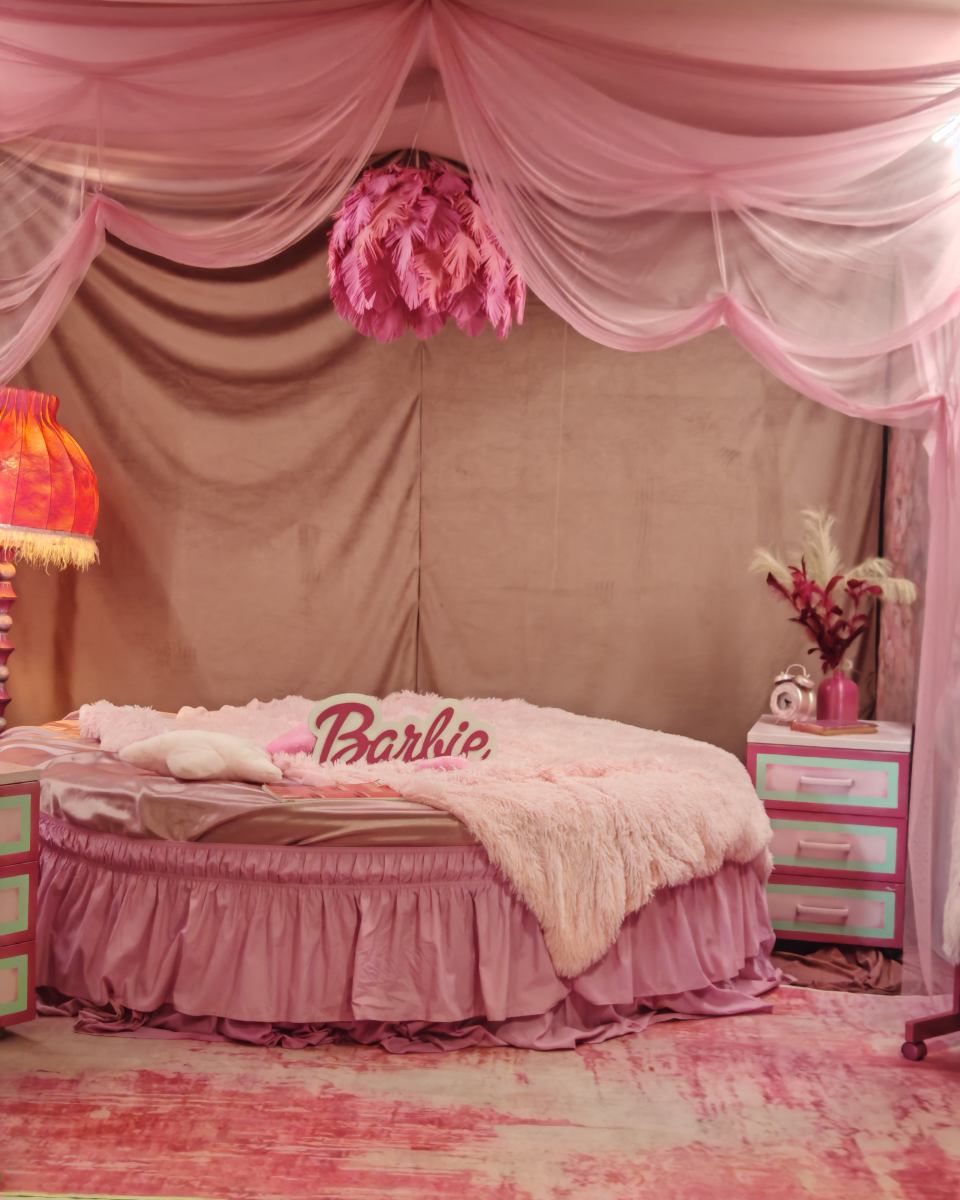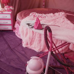 круглая Кровать, торшер, тумбы, шторы, подушки, ретро телефон розовый, будильник, одежда для локации