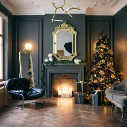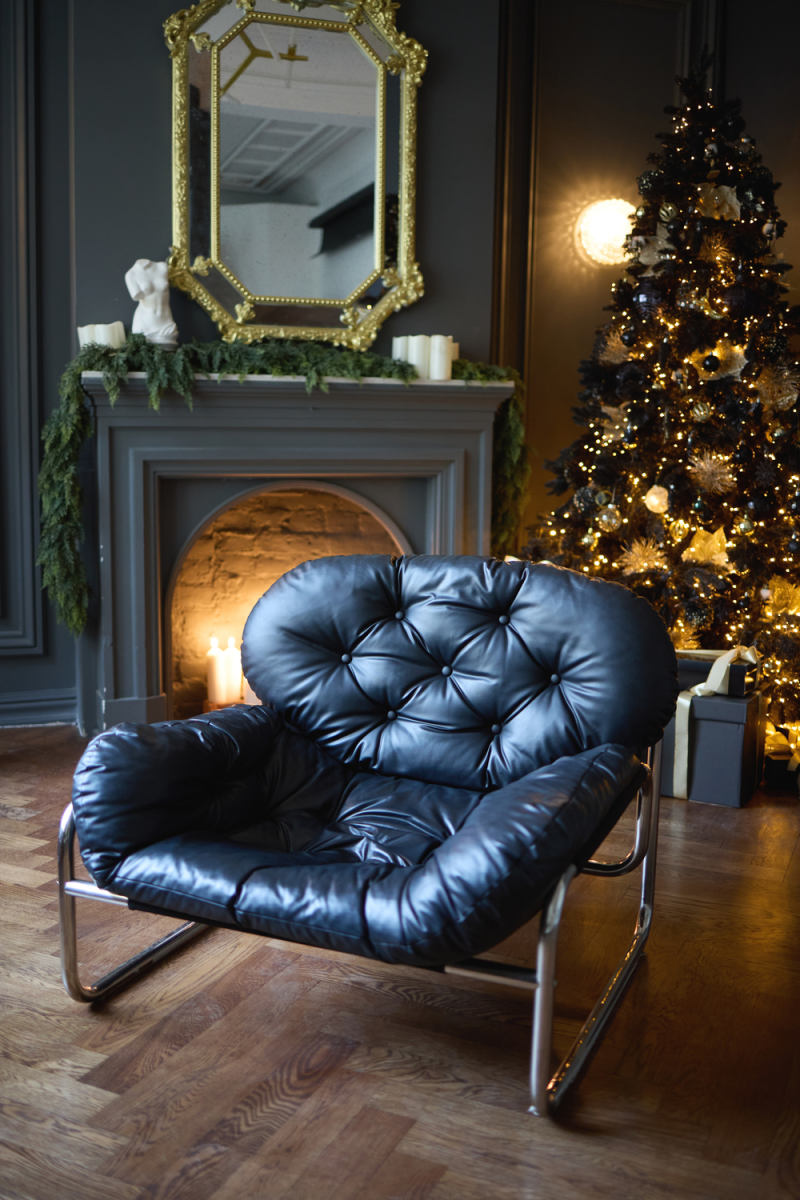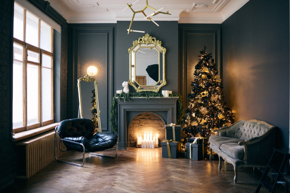 Обновленный осенью 2024 года минималистичный интерьерный зал площадью 50 кв.м. Пол - паркет, массив дуба с темной тонировкой. Стена с деревянными темными