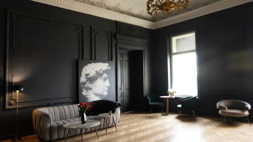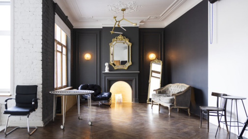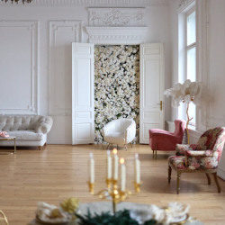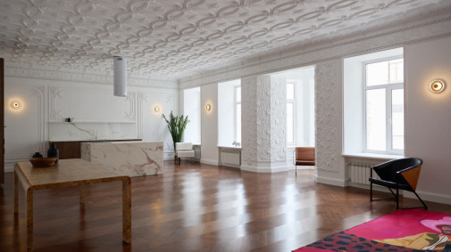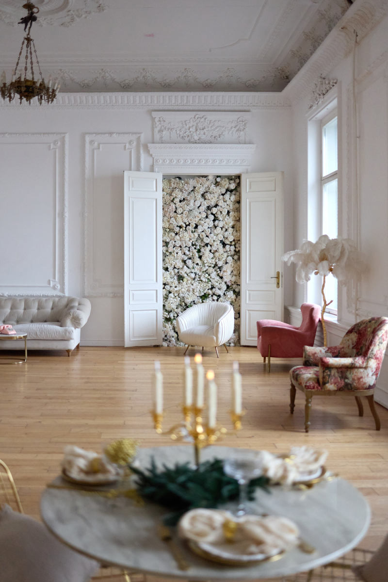 Уютный зал площадью 50 кв.м с циклорамой и интерьером. Прямая белая циклорама, гипсовая лепнина графитного оттенка, пол - настоящий дубовый старый паркет