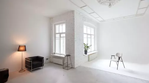 Зал площадью 45 кв.м с белой угловой циклорамой. Основная часть зала - 35 м (5.2 х 6.7) +11 кв.метров дополнительная часть, оборудованная собственным гримерным