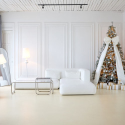 Уютный зал площадью 50 кв.м с циклорамой и интерьером. Прямая белая циклорама, гипсовая лепнина графитного оттенка, пол - настоящий дубовый старый паркет