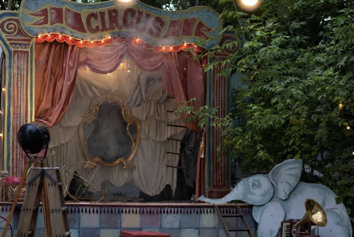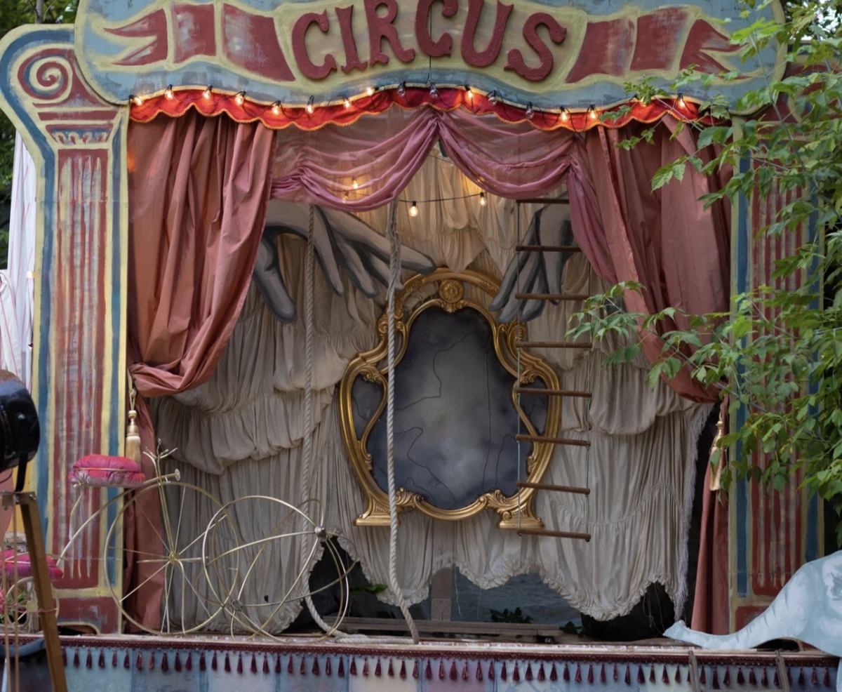 сани с оленями, много яркого реквизита, конфеты, мороженное, коробки. Можно добавить самоедов или живого оленя