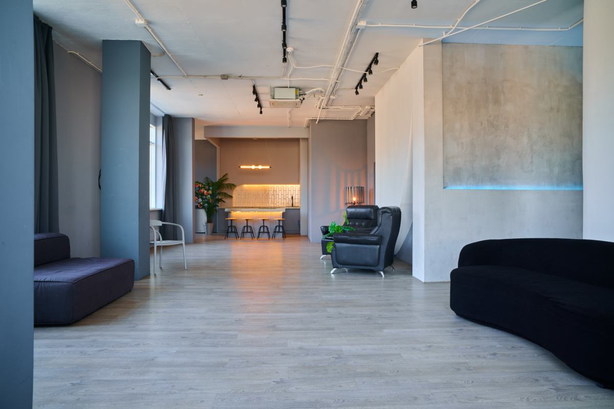 «Графит» просторный зал с кухней и мокрой точкой в нашем пространстве, многофункциональный зал; тут проводят фото- видео съёмки с большой командой, записи интервью и подкастов, видеосъёмка танцев, выступлений, различные деловые и веселые мероприятия,