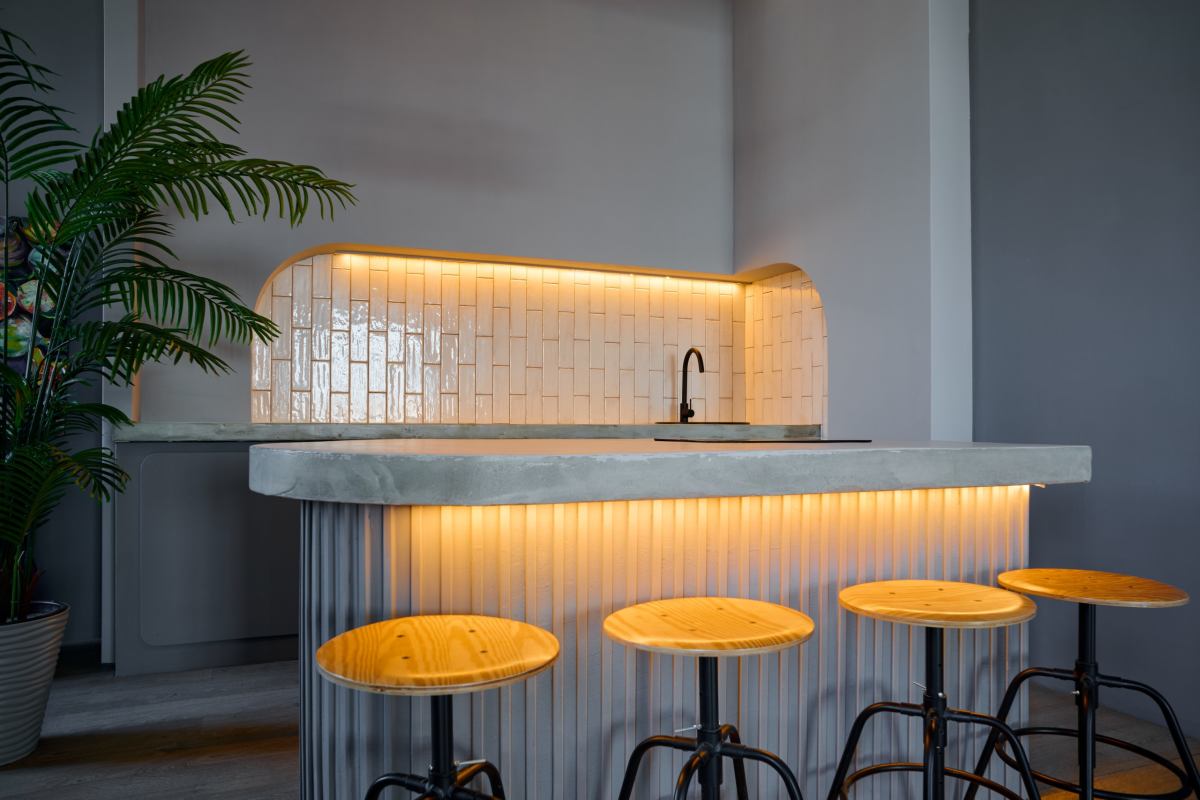 Минималистичная кухонная зона с раковиной и 2 конфорками для готовки (плита электро). Естественный рассеянный свет от больших окон добавляет мягкости серым оттенкам интерьера, окна можно затемнить шторами блэкаут. Прекрасно подходит для любой контент...