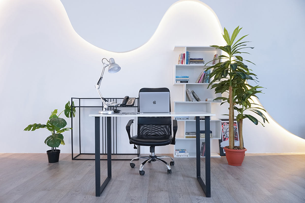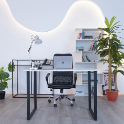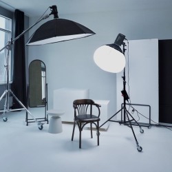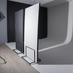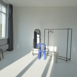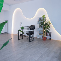 Просторный зал с белой циклорамой шириной 5,2 м. с выступом на 4 м. и большими окнами на солнечной стороне (закатное солнце), что дает много естественного света с двух сторон. Так же в зале имеются шторы блэкаут и оборудование Profoto d1−500. Вторая зона с подсветкой в виде волны, имеются рейлы для одежды и 2 флага на колесах, диван, стулья, столик и зеркало. Циклорама входит в стоимость, но если видны сильные следы использования, то оплачивается